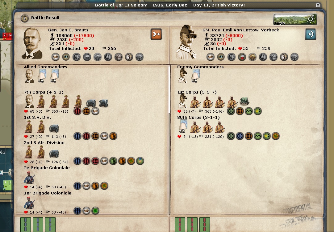 And last but not really least.... Battle of Ost Afrika. We're gaining on them. We lose more troops but we can afford it. Attrition is wearing them down and I hope it means we eventually capture this settlement.