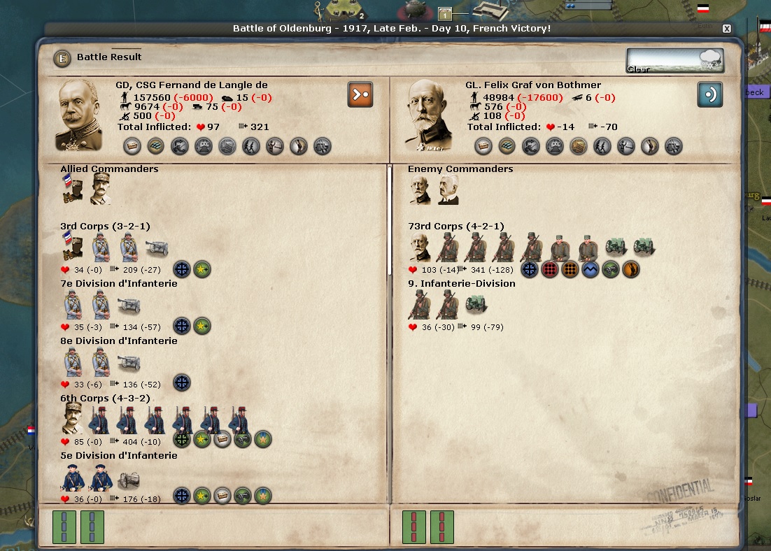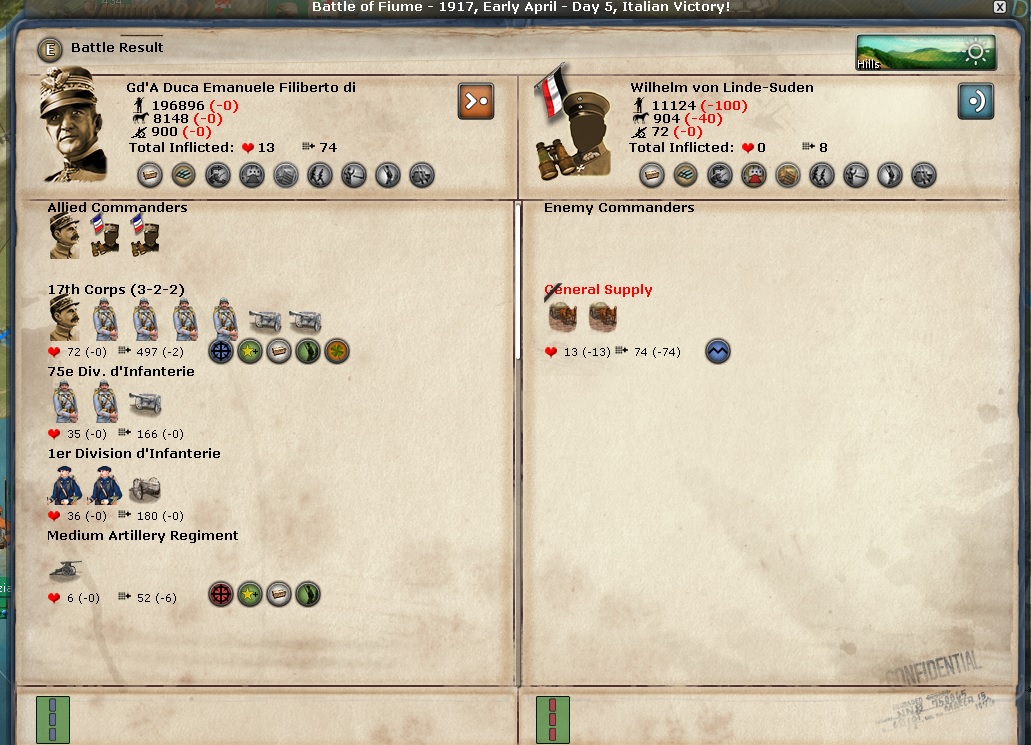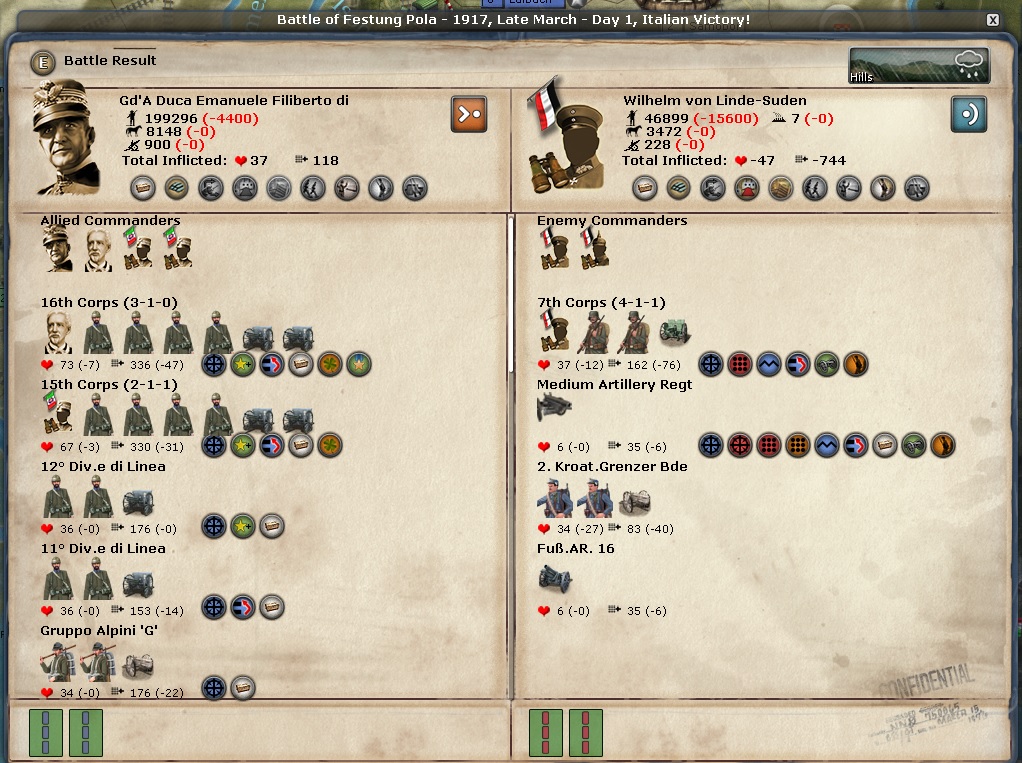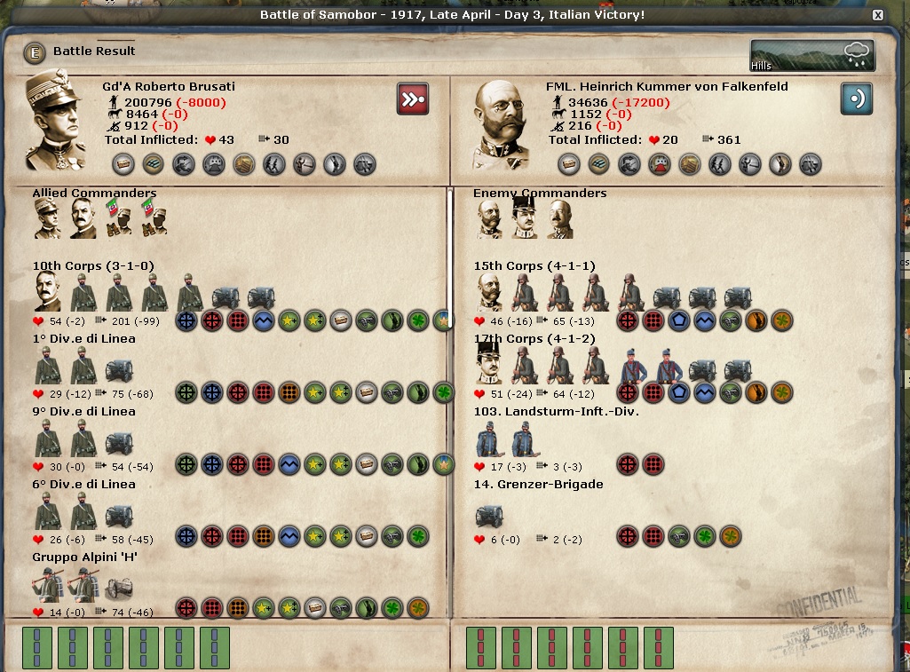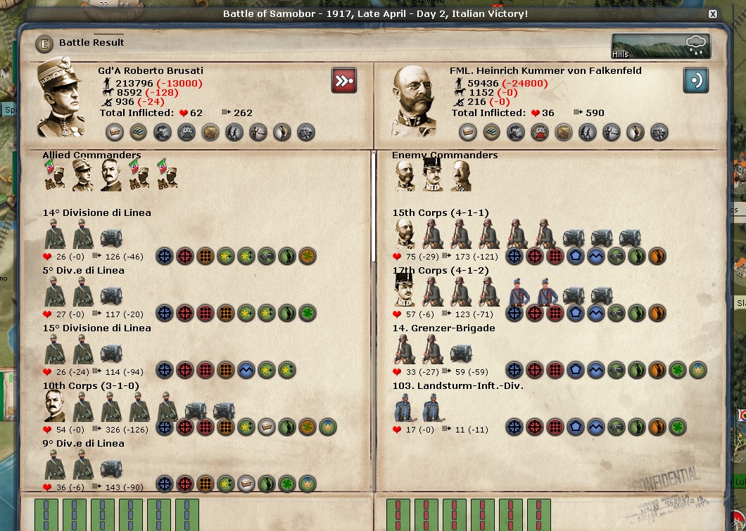 Any discussion of the Italian Front begins and ends with Samobor. Brusati is the overall commander there and he is a 2-1-1 general. I would think he would get huge boosts to his stats because the CP keep attacking from Zagreb over the Sava River and they keep losing very big battles. Those battles are sapping the CP's will to fight.