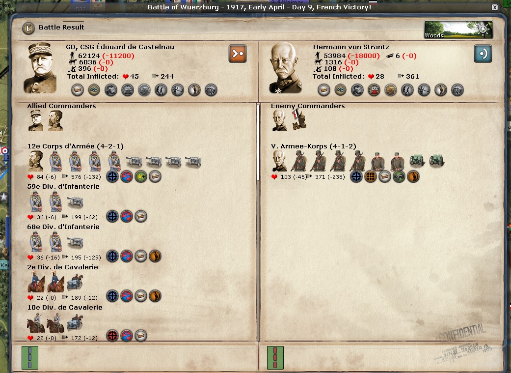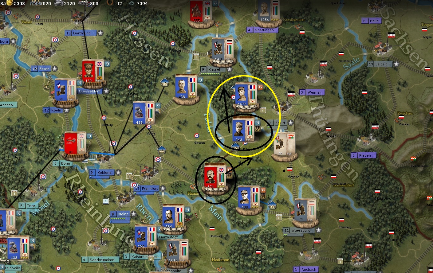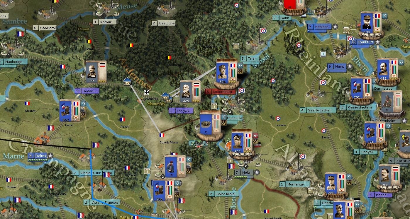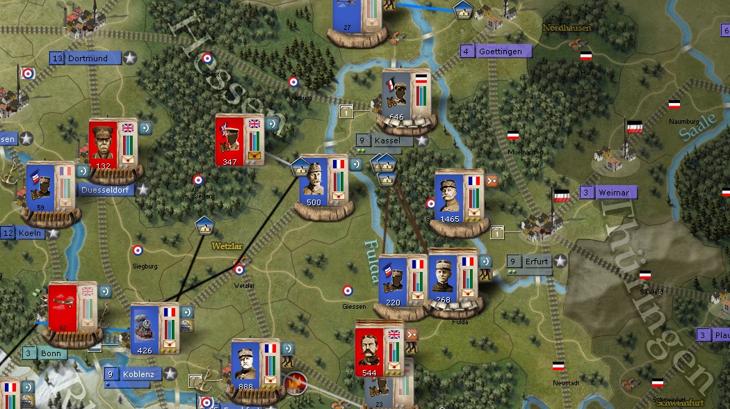 I have full breach on Kassel and the formations there will assault this turn. I have put a lot of formations in Wuerzburg to offset the two German formations to the South. Those German formations are very large and the longer I can keep them down there, the more Foch and the Kassel formations have to force a corridor to Berlin.