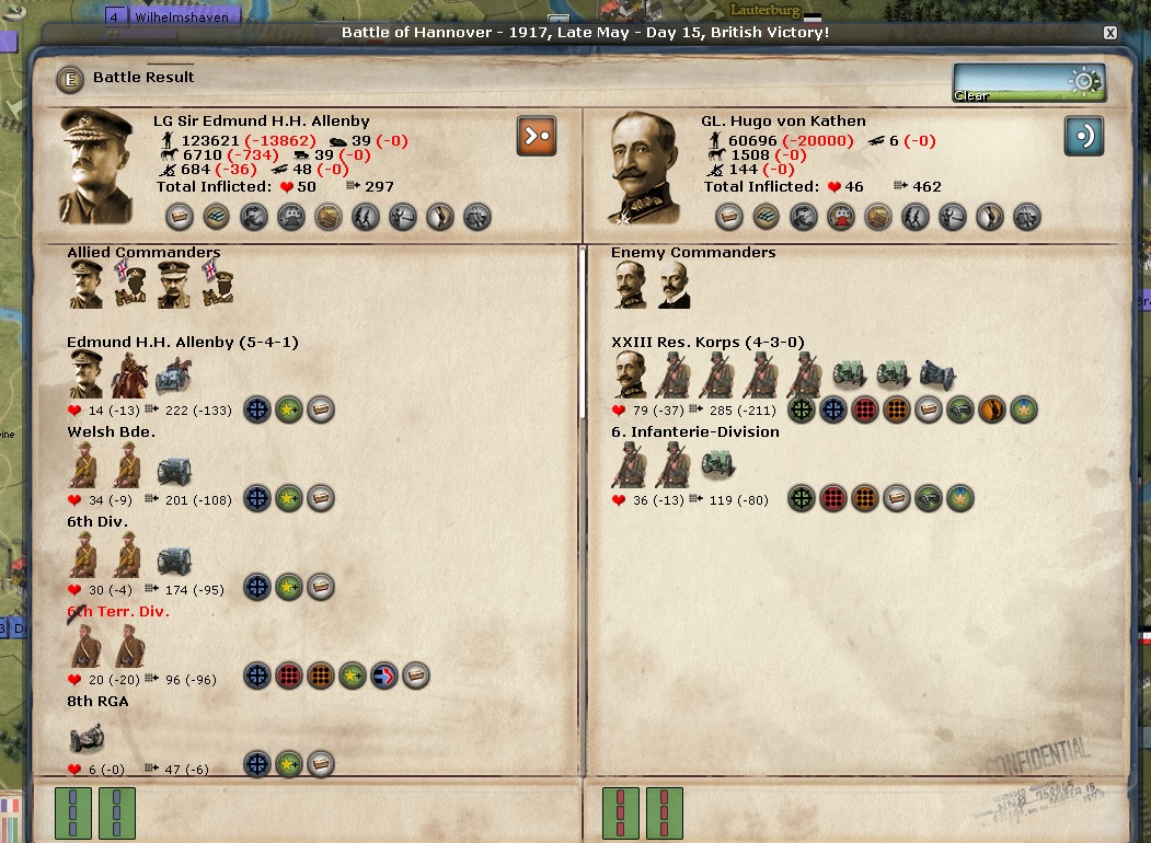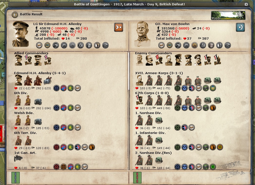 Battle of Goettingen. Allenby seems to always be getting a bloody nose. I need to start using him in a better way...... We lose Battle of Goettingen, mostly because I had no recon of it and thought it was empty.
