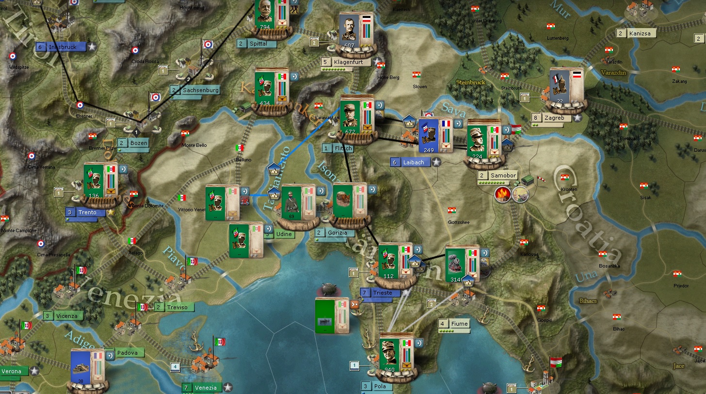 I keep fortifying Samobor with more troops because of the many big battles we have had there. The troops that took Pola move to Fiume and then eventually North to support the Samobor formations.
