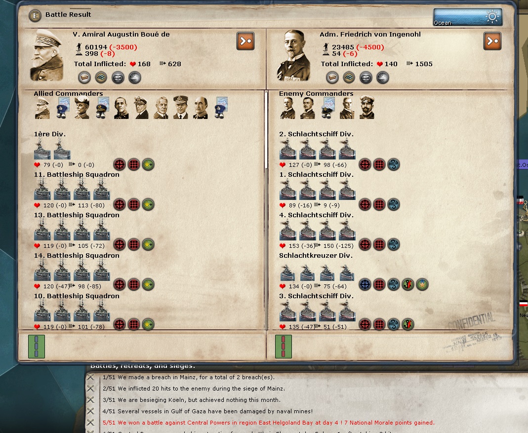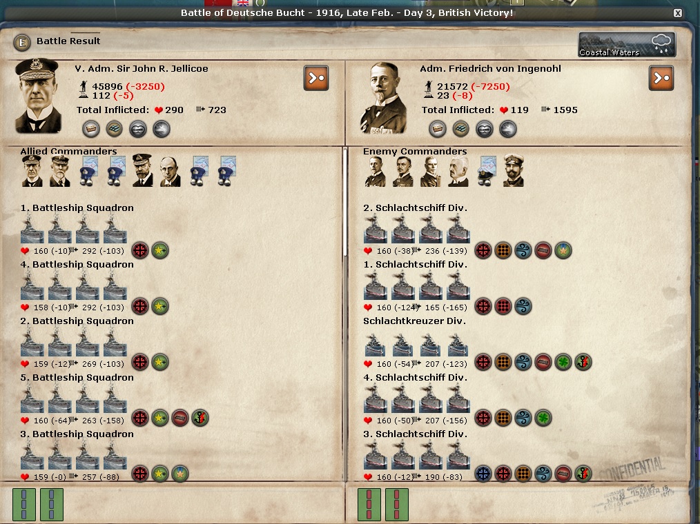 2. - You have won most NM through naval success. So far in my game the German fleet has managed to send Beatty's cruiser fleet to the bottom of the ocean. My High Seas fleet has been roaming around the North Sea training its coat but hasn't managed to find a German fishing boat much less Admiral Scheer !!!