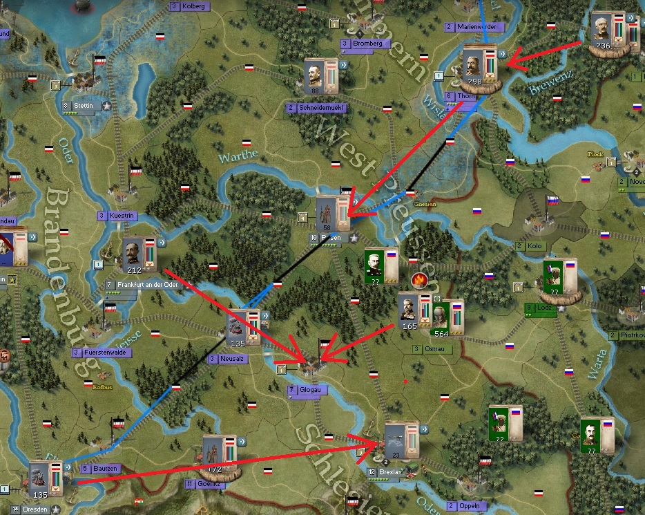 In West Prussia, Hindenberg will assault the russian 8th army in Ostrau, having reformed his forces with reserve units from across west germany. A second force will support on the right flank. Hausser's 3rd army is out of communication, apparently. No communications are reaching him that we are aware of, and so we expect him to hold firm in Posen.