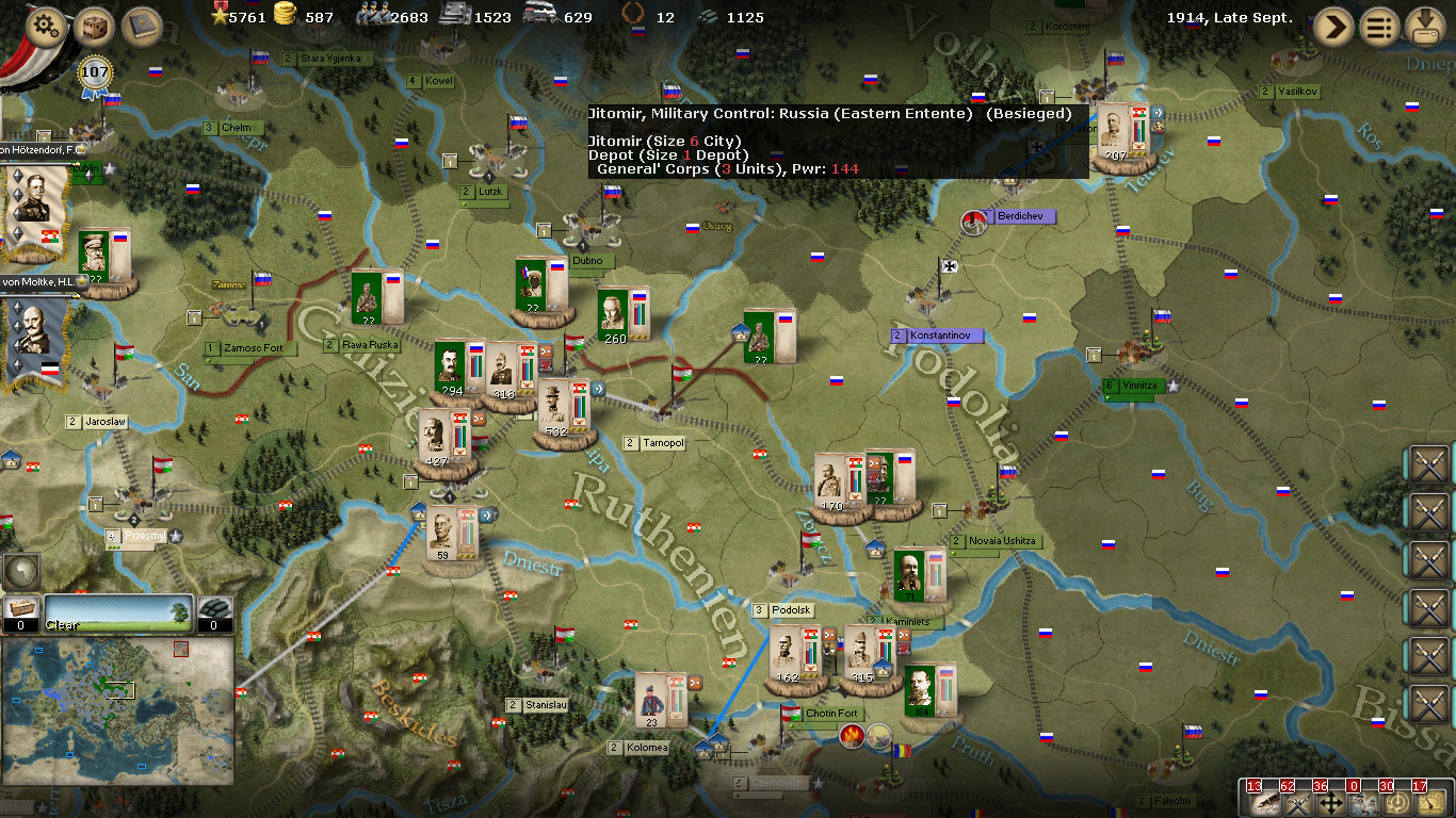 After having destroyed most of Scherbachevs' northern pocket, the noose tightened around the armies in the Volyhnian fortresses. Nikolay Nikolaievych's force attempted a breakthrough in the south-managing to destroy an Austro-Hungarian corps in the process but only partially succeeding, he's now at Rava Ruska and might be hoping to salvage something from within the Polish pocket. Either way, a fair amount of his force is still left within the fortresses-and after the fall of Kovel looks close to being captured entirely. Some corps have moved tenuously through Zhitomir into the Pripet forests, but my constant harrassing of that line slowed their task, and a recent attack on Zhitomir has threatened to cut these forces off as well