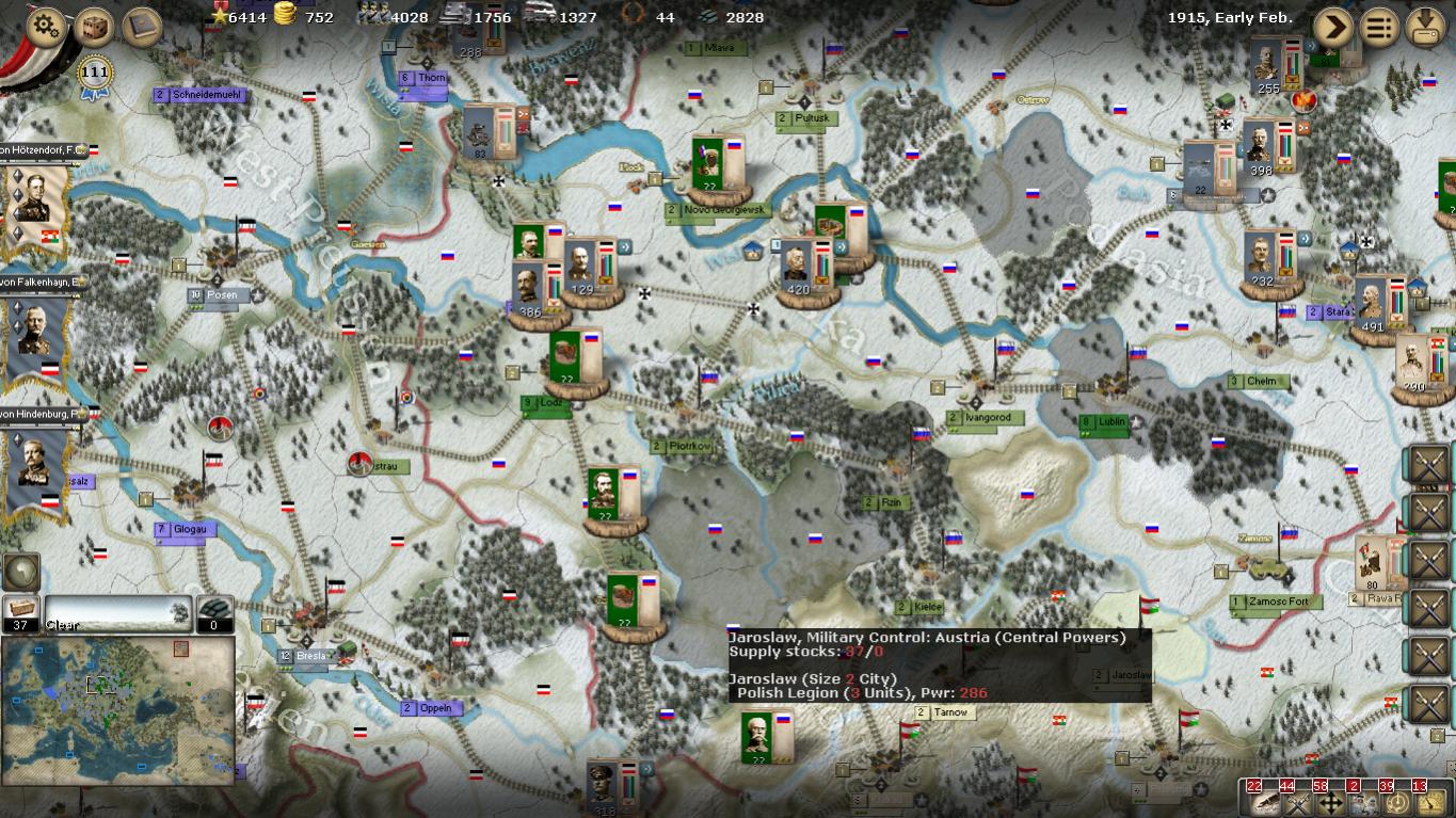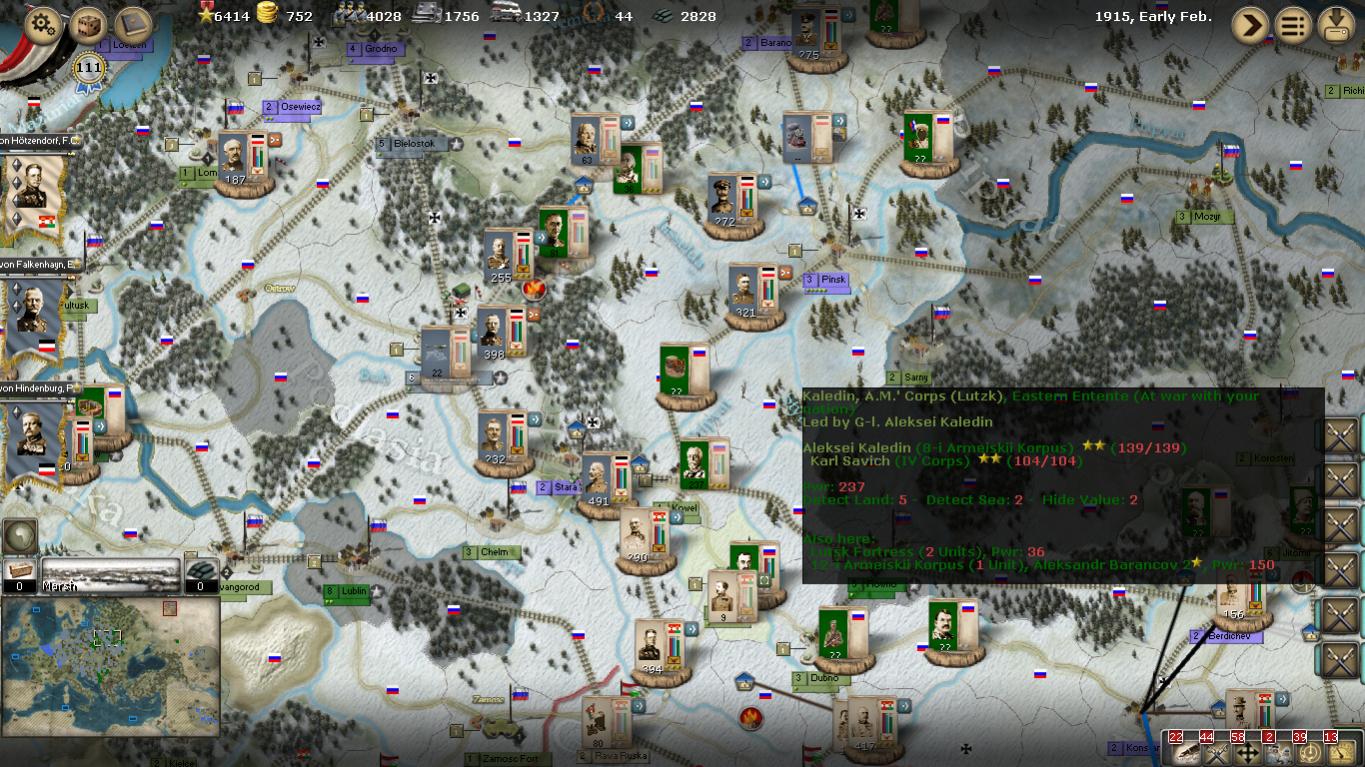 In the East Vinnitsia witnessed an inspired defence, but is about to fall-last round only 3000 infantry and the artillery firing at point-blank range managed to hold the final onslaught, but now I suppose even they have run out of ammunition. With the Winter behind us and the ground hardening-1915 looks set to hold great things in Ukraine. Oh and two newly formed corps and the Cavalry Army are pushing into Bessarabia as we speak, although the Vinnitsia forces will probably cut them off near the border anyhow.