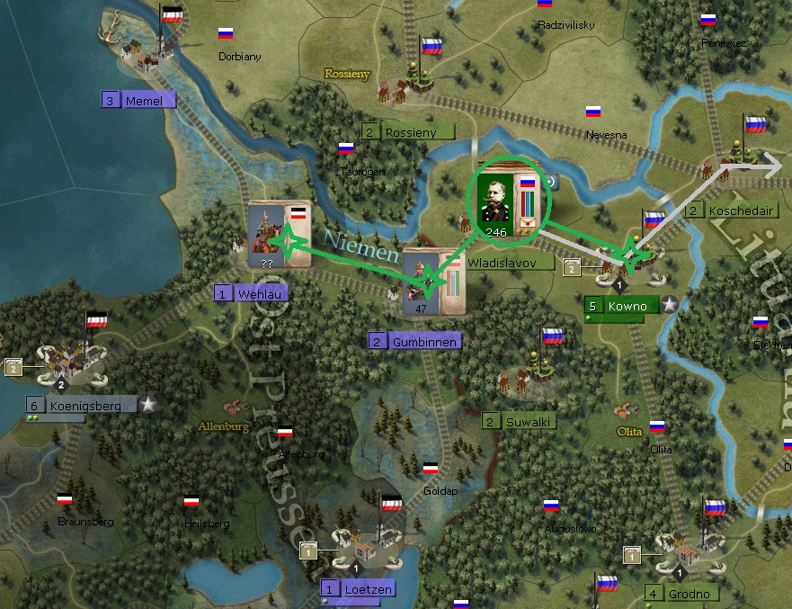I make a brief foray into enemy territory, chiefly to serve as an advance line of defense as I build up my positions to in Kowno.