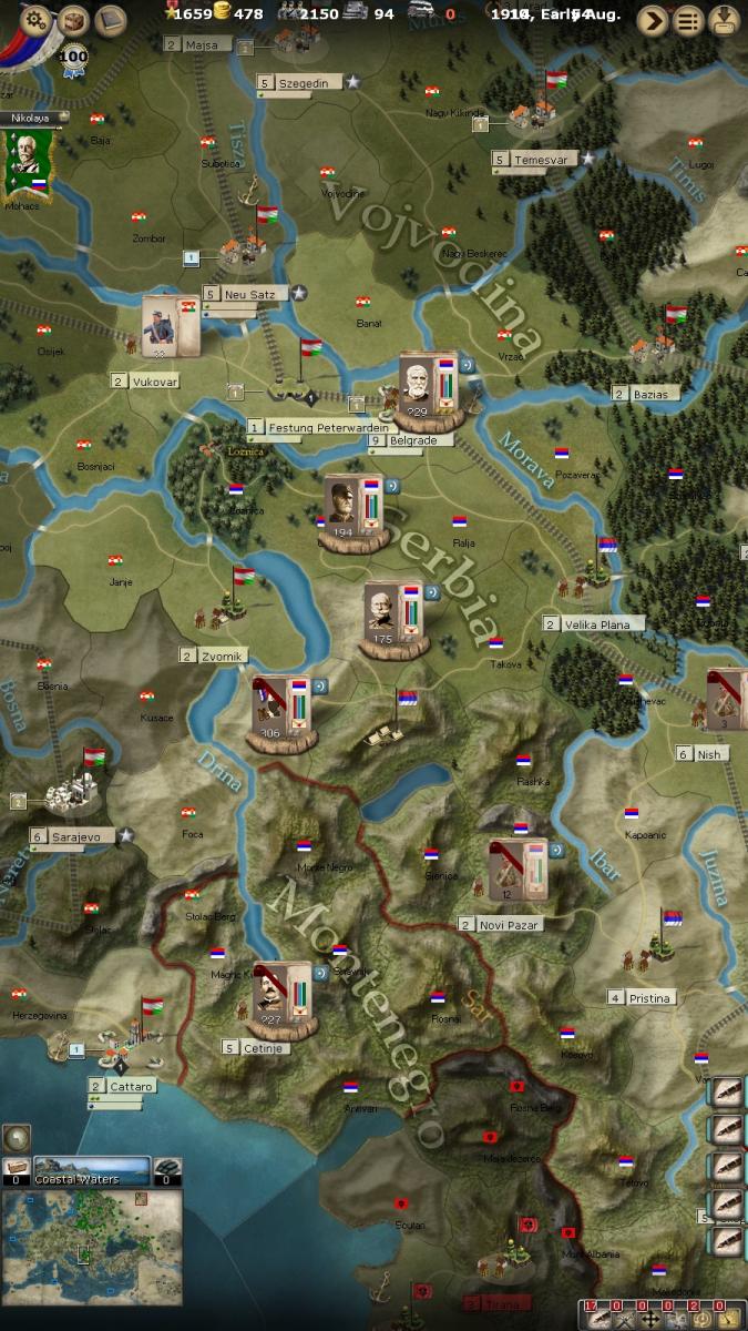 My plan for the Serbians, is to hold ground. Even giving them priority in resources over Russia. After we have established a strong defensive line. We may hesitantly step our toes into Vojvodina, south of the Timis River. Always keeping a river to our fronts. Possibly.