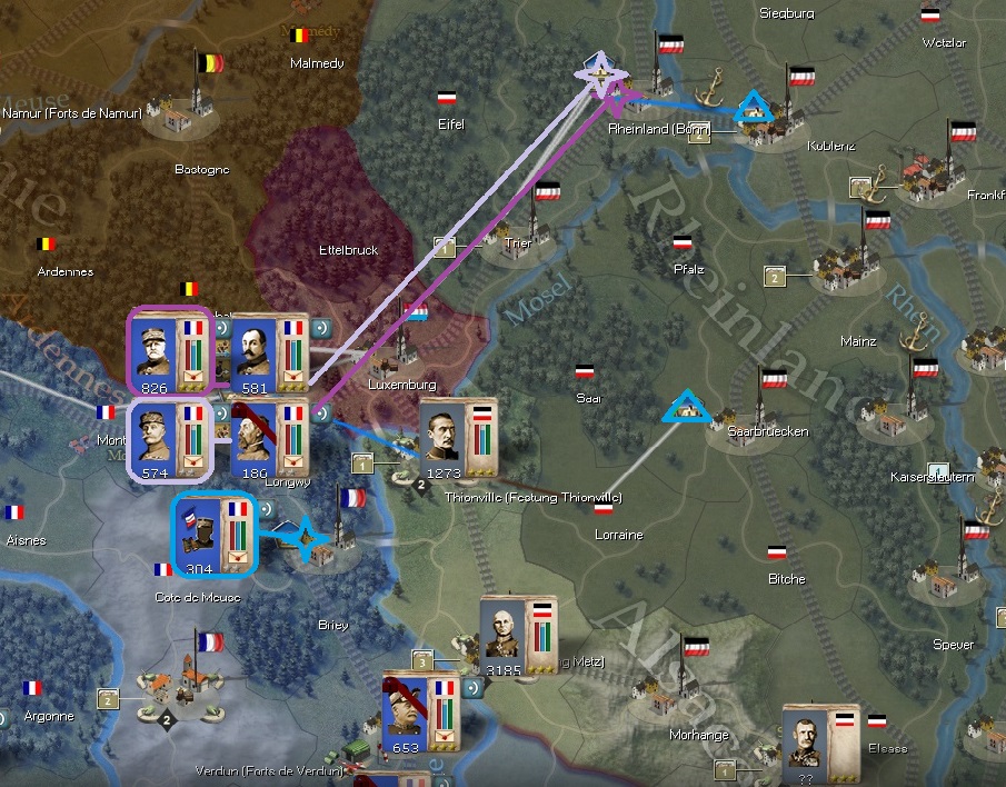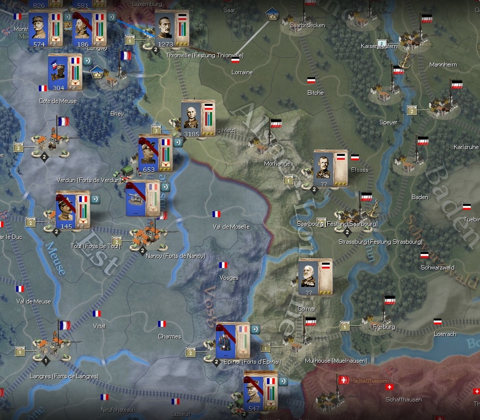Although not shown in that screenshot, one addition I added is a reduced Corp to attack Morhange, set on G/G, and evade, only to swoop in and next turn to cut the railway lines. A bit risky. I calculate that if I show an aggressive demeanor, I may drag more German troops to this Front, especially while the front is not entrenched, and if they see me as a threat against the North Rhineland, they may focus their attentions towards in reinforcing North verses defending this front.