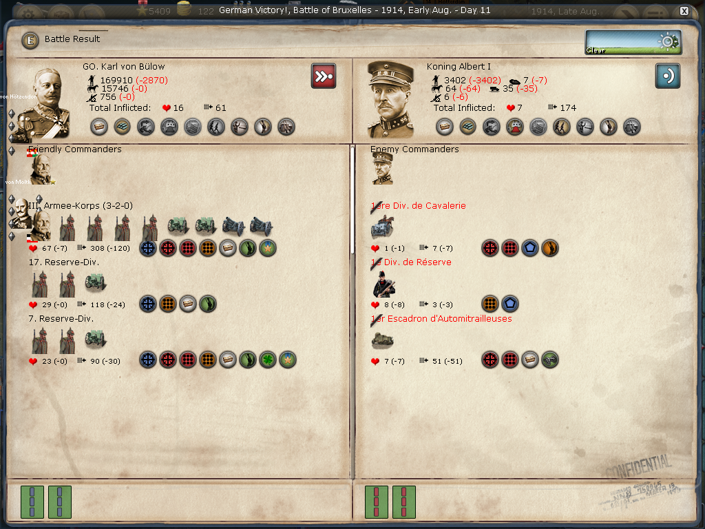[color="#DAA520"]Belgium:[/color] I was happy just to siege Antwerpen, however, the WE decided to attack when reinforcements arrived. I lost the first big battle then won the second smaller battle. All in all, Antwerpen is in a much weaker position barring massive British troop transports. I have 2320 PWR surrounding it and it appears to have 384 PWR (although I'm not seeing the 400 PWR in prior artillery defenses). It appears the once formidable forces in Genth are now much smaller as they reinforced Antwerpen and met with a retreating loss in Mechelen. I'm not sure if the bug that effected crazy movement (of my forces) is still there or if I badly misclicked, but the unit that I had railing to Mons ended up marching to adjacent Longwy (I was able to call off the movement, fortunately, only taking cohesion loss). I am not seeing a lot of WE strength in Belgium or Northern France.