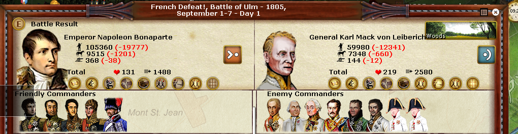 Just some quick thougths: The battle took place in the terrain "woods" and two corps had to cross the Danube (one wihtout bridge) to get to the battle. That might explain why MTSG didn't work out that well (also depending on how many rounds the battle lasted and on weather, plus the stance and activation status of the corps leaders)?