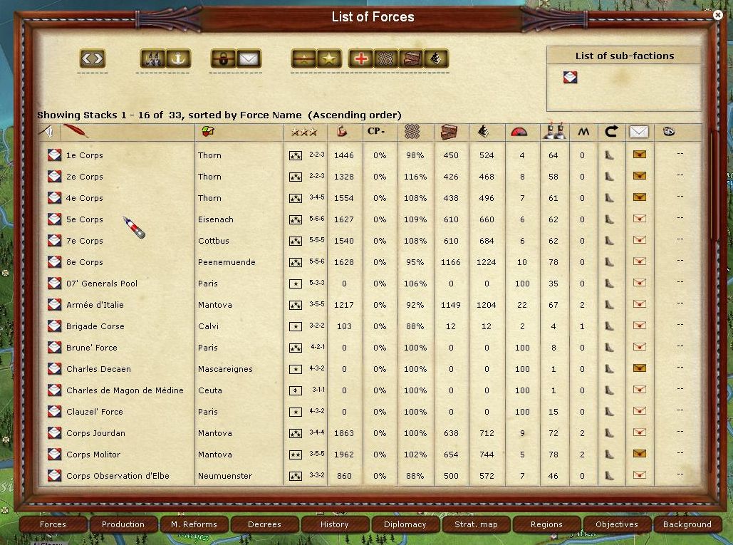France has => 75 elements within the Prussian recruiting area--which I assume means the regions where Prussia can recruit (build) units.