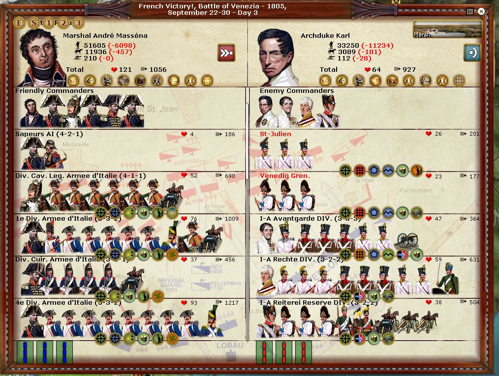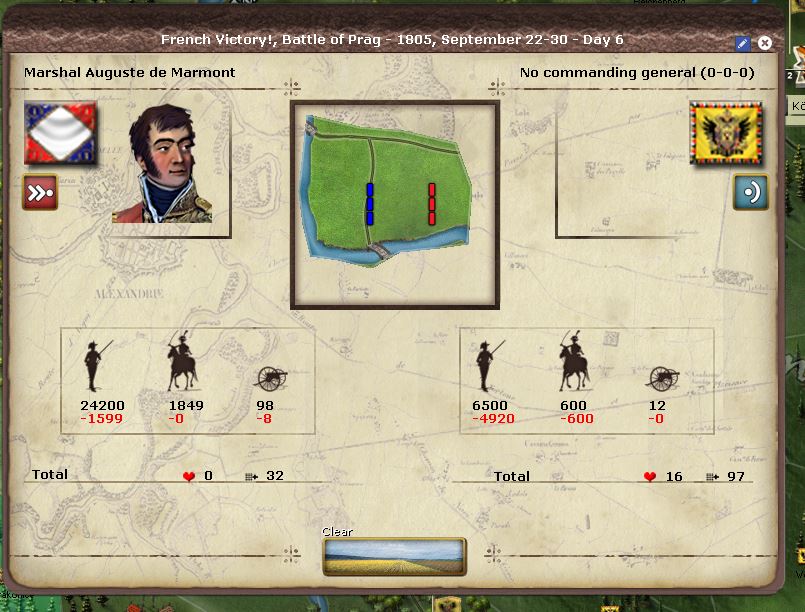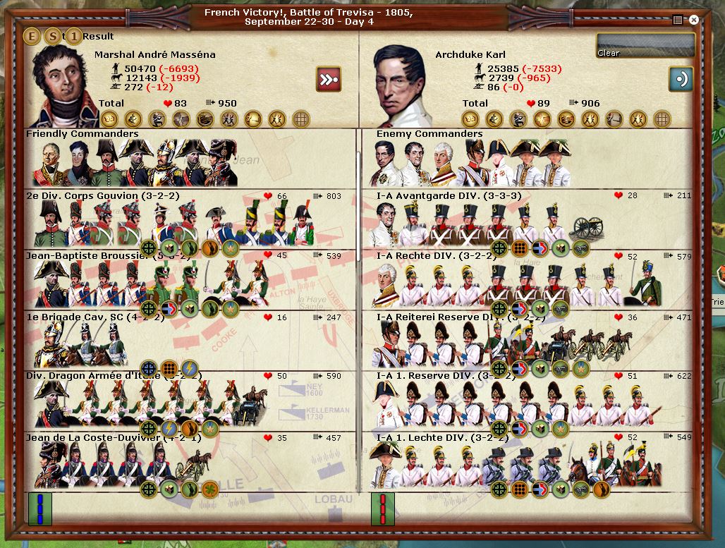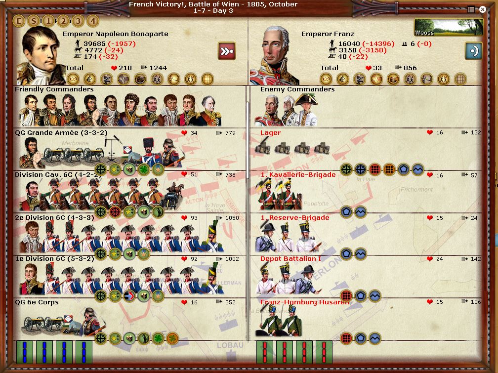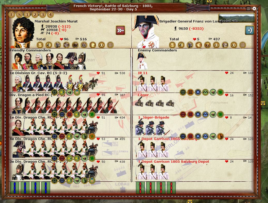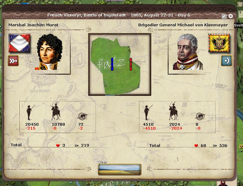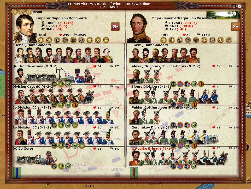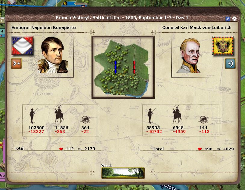 veji1 wrote:I know it's the mid 1805 campaign so the Austrians are made to get trashed, but damn some battle results are just extreme. I would like to see those Mack losses (40k) against Napoleon explained : is that surrender from inside a structure ? battle losses ? If it was a battle on the field, the more "historical" way this army would have been destroyed would have been tactical and then operational pursuit, as almost from the get go the Austrians would have been trying to extricate themselves from battle.
