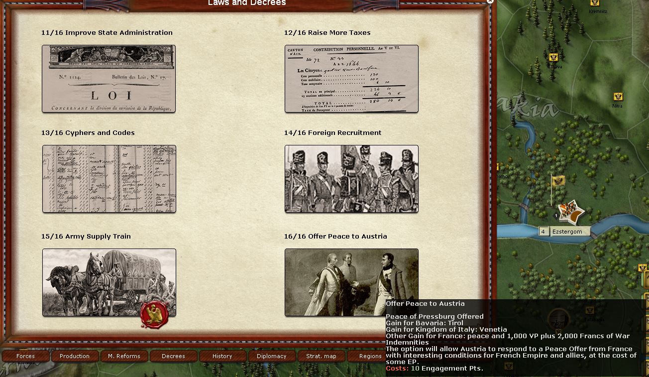 PhilThib wrote:Austria offering acceptance of Pressburg decree should translate in immediate peace with Austria + Bavaria getting Tirol and KOI getting Venetia...you should see those changes on map at once (provided you play with the latest version). If not, some event fixes missed the bus....will need your saves and the script reports on the turn you issued the decree and the following ones