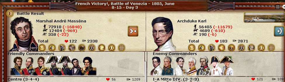 He looks like he's have a perpetual bad hair day. Talk about comb-over. Massena is a 3-5-5. When leadership is somewhat equal, the French aren't as awesome. I have numbers once my troops replace a few losses.