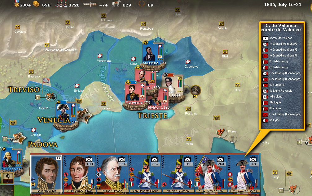 Massena and his commanders move through the Veneto towards the present Slovenia. This is a main road, but due to the rivers and poor civilized areas progress is slower than elsewhere. In the second week they finally detect in Trieste its Austrian equivalent: the Italianische Armee, led by Archduke Karl, a general who stands out in the Austrian army with values of 4 on all of his characteristics: strategic, offensive and defensive.