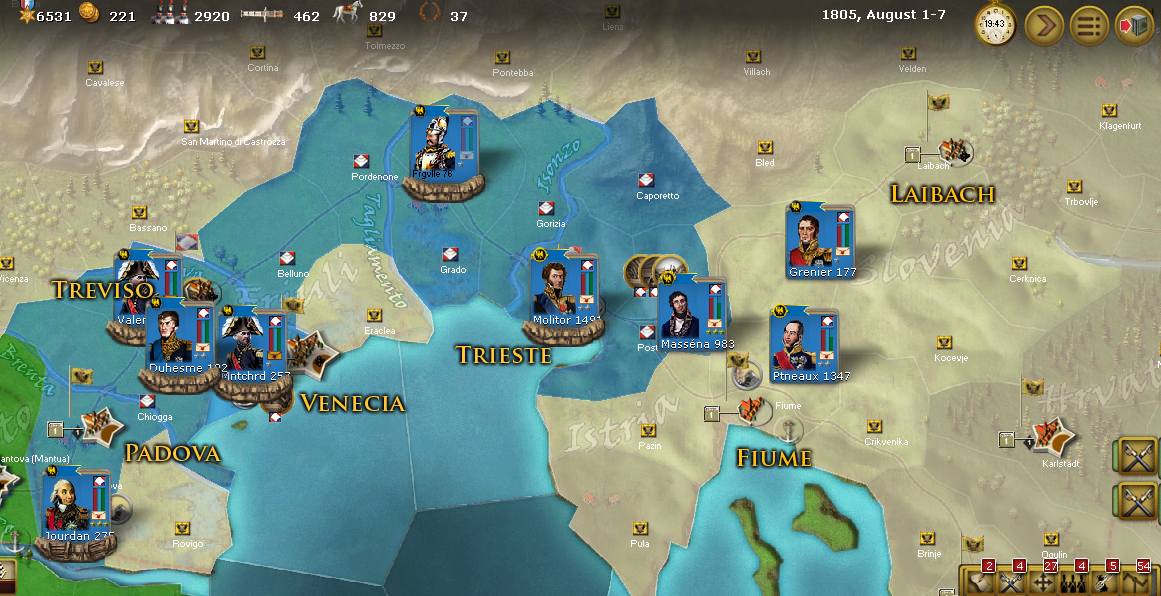 When the hangover ends, he continues his advance with the fresh forces. Molitor’s soldiers are recover themselves in Trieste. Partouneaux arrives to Fiume and puts it under siege, while the explorers approach to Laibach but find no trace of Archduke Karl... Where is he gone? Towards Vienna, Hungary or the Balkans?