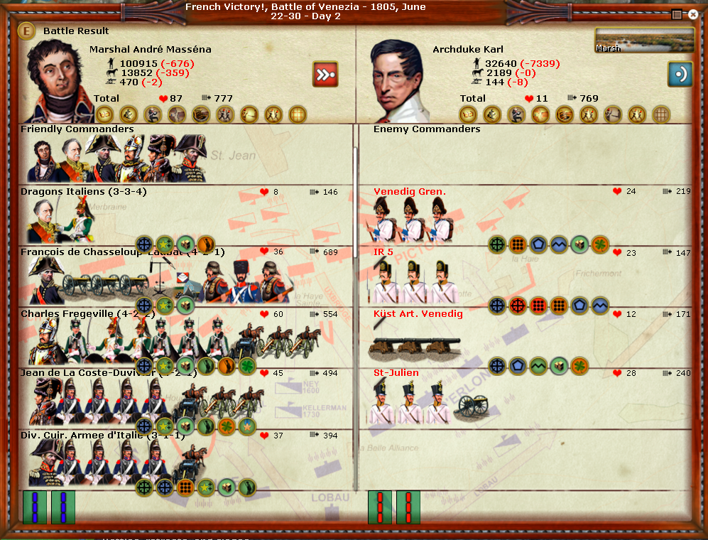 After 3 huge battles and loss of 16NM, Nappy retakes Wien, which had been won by Marshal Soult on the cheap.