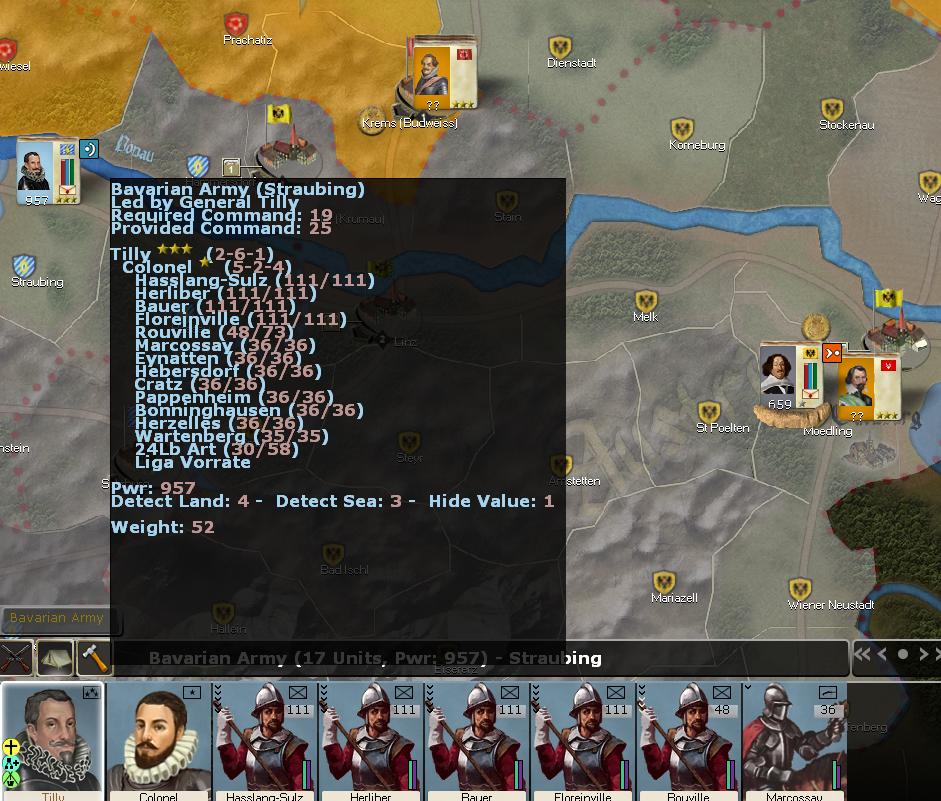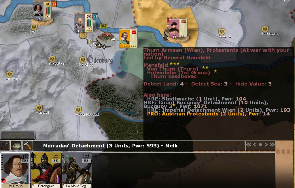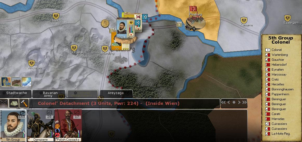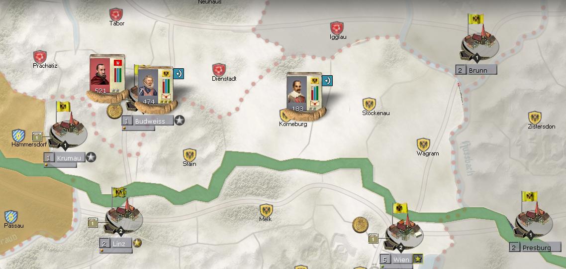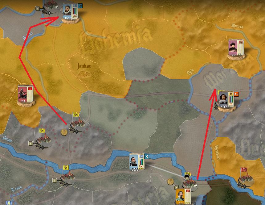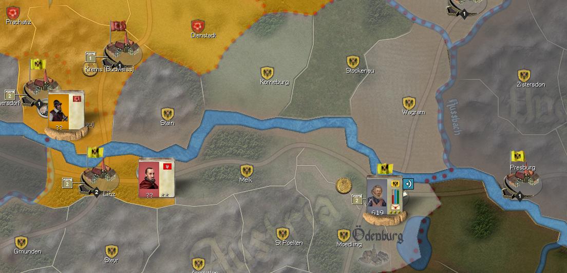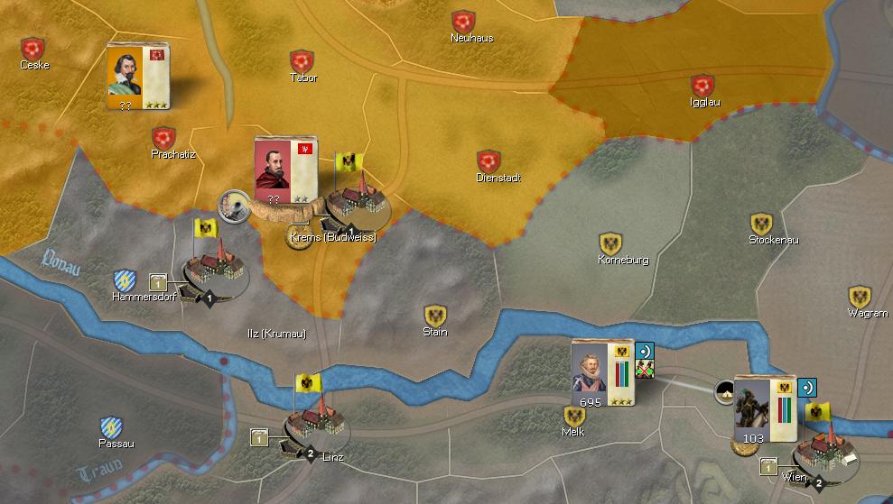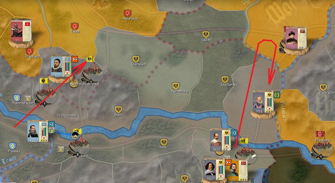 AI can have problems crossing large rivers and returning back. Placing 2 cavalry detachments in Budweiss and Ilz can lock movement with enough ZOC when Bohemians decides to move Linz.
