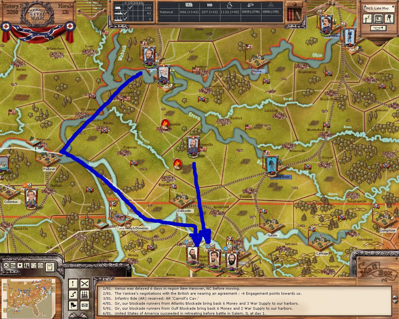 The Union has four stacks concentrated at the Kentucky border. However only Foster the one in Muhlenburg attacked by land. The other stacks went via the river, as did a fifth stack that was hidden from me by FOW. Frankly, the attack took me by surprise. I remember that I was flabbergasted when I watched all those Union stacks shipping down the river. I am still wondering where Athena got the neceassy river transport capacities???