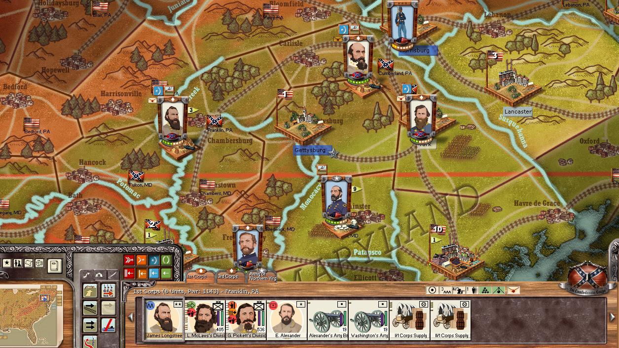 This scenario would be greatly improved if, rather than starting the forces poised around Gettysburg, instead have the forces as they historically were positioned in early June (e.g., the ANV around and to the west of Fredericksburg), then specify Gettysburg and possibly other places north as VP objectives. (Fixing the original too-slow movement rates makes reaching Gettysburg by early July newly possible.) Is there any rule that says this original-game scenario is immutable, that we have to honor and keep to its original design?