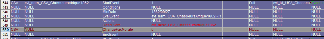 Shouldn't the EvalEvent be evt_nam_USA_ChasseursAfrique1862, instead of CSA? The USA event is in the USA Events file, and triggers if New Orleans is US owned with no adjacent Confederate units between 27 Sep '62 and 1 Jan '63. It gives the USA a regiment and 100 conscript points.