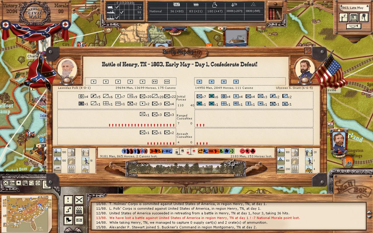 It seems I just made a huge mistake in my PBEM. Massive NM loss despite more than 2 to 1 odds. I wonder if it is because Polk was in command with is 4-0-1 settings. Is he worthless on the attack with a 0 offense? Check out these battle logs. I'm just totally stunned.