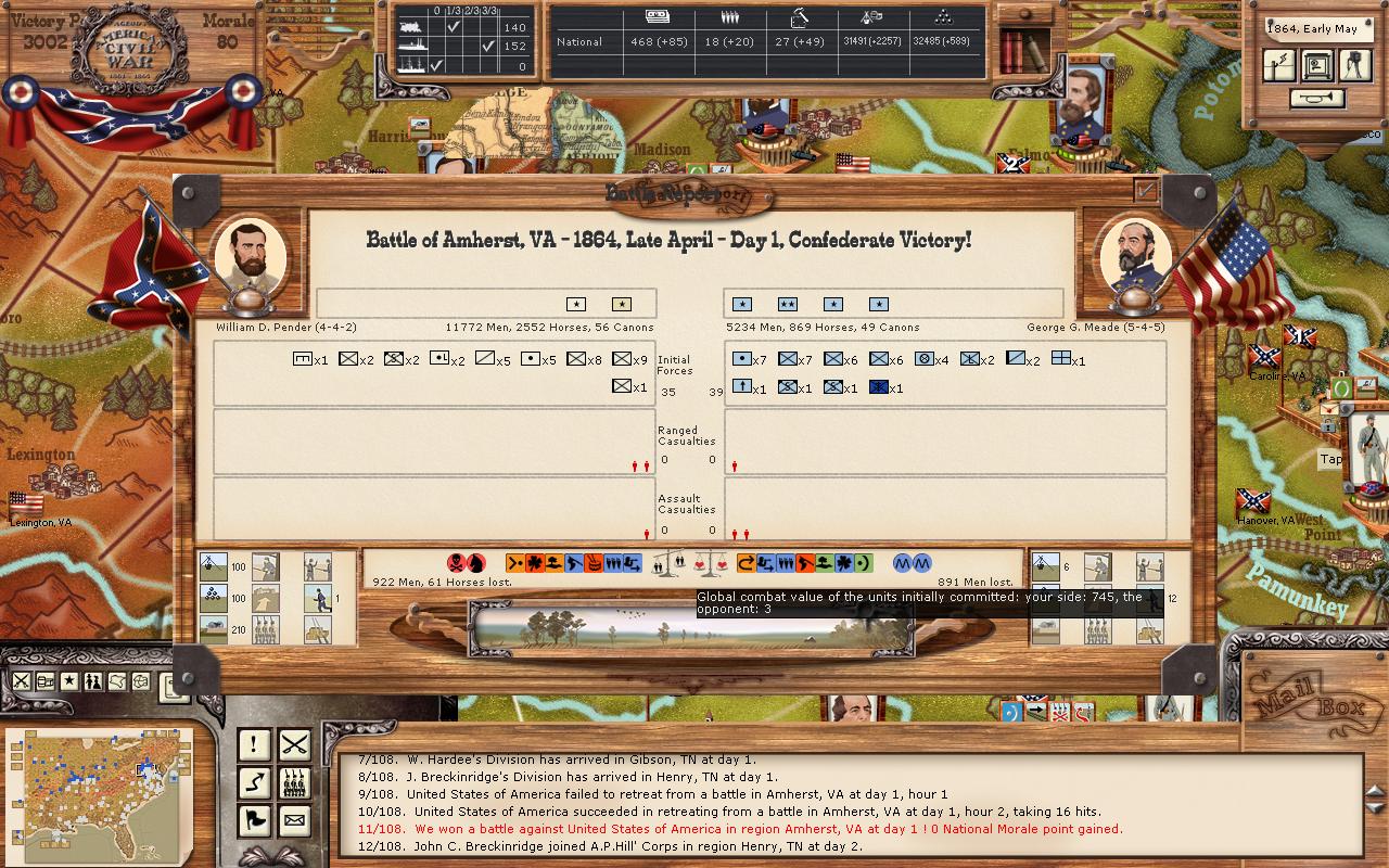 Jim-NC wrote:The 3 refers to their power level. It appears that the union was out of food (6% of what they needed), and probably very low on cohesion. I can't see if they had run out of bullets as well. As for the casualties, they started with 5000+ troops in the area, so under 1,000 casualties isn't bad.