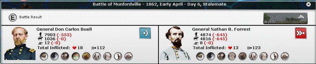 Much jockeying for position and some small skirmishes but no objectives change hands yet. USA making progress in MO and Virginia while KY is for the Rebels with Louisville besieged & breached by AS Johnson but still withholding against assault.