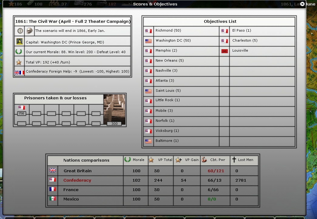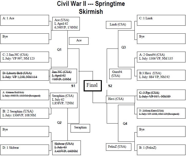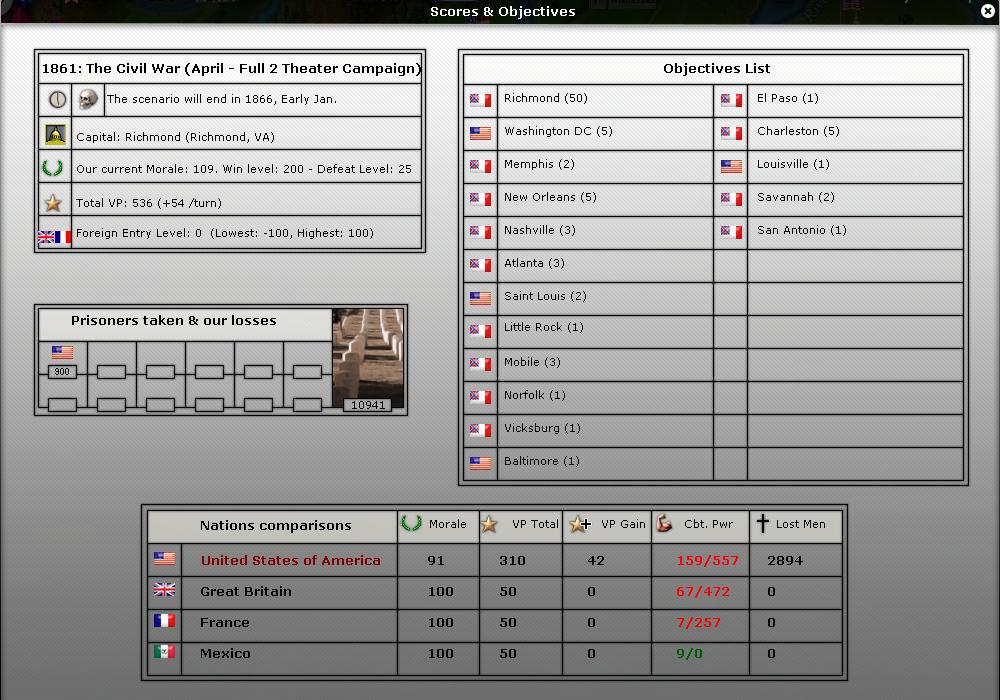 The next round will play the April 61 campaign through Early July 1863 (final score will be the score shown at the start of Late July 1863, turn 56).