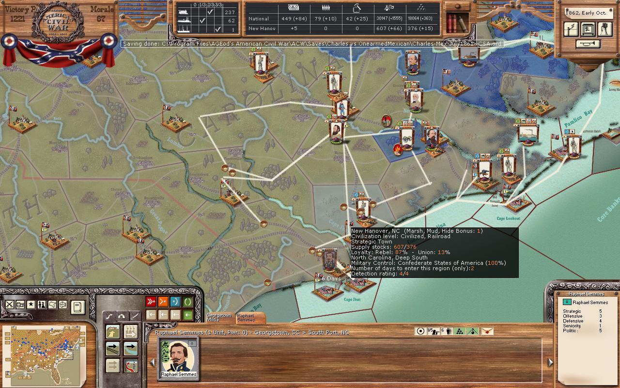 This is how you learn to play better, and I bet you've learned a ton already. OAM will surely teach you, as he is a stern taskmaster! Longshanks wrote:I guess you see the handwriting on the wall. It will be hard to resist for many reasons that I see: 1) your NM is so low and so your cohesion is low too; 2) you're outnumbered by cannons in every fight; 3) you lack support troops like hospital and signal in nearly all your stacks, while he doesn't; 4) all his victories have earned "stars" for his leaders and units, making them get better while yours get worse; 5) your supply situation is rough as you have noted - lack of SUs makes combat go badly - even VERY badly in later rounds of a fight because you lack ammo; 6) you've attacked several times across rivers but without Marines/sailors, etc to help you with the river crossing, thus incurring a stiff penalty. I'm sure there are more.