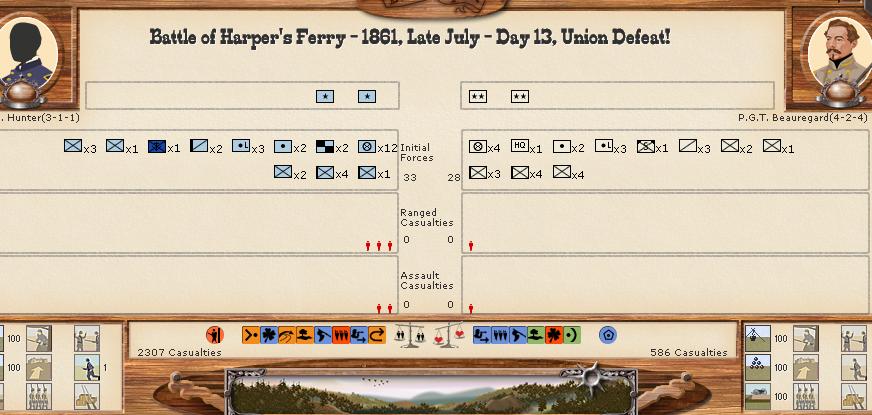Lost cav battles in Culpepper and Clarke and ended up in Winchester ungarrisoned. I will stay there with my 2 cav reg. until I get asked to leave. I also lose a lessor battle in Stafford trying to keep my control there and keep the reb units trying to do repair duty away.