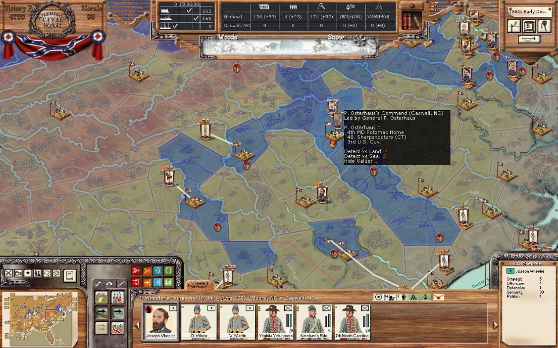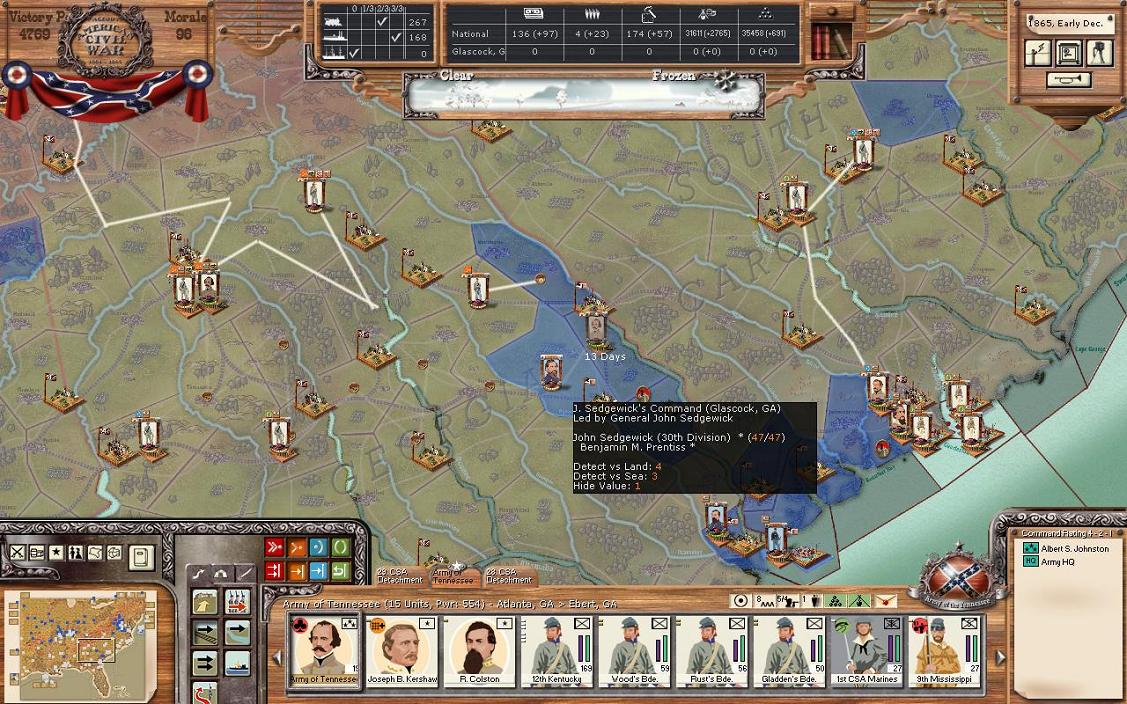 Looking at TN you’ll see that a couple Union brigades have moved to cut the Pulaski Nashville RR. Nashville has 443 GS, so this doesn’t really matter now. A division led by Buckner will try to capture the rest of half of the Union force in TN. Hampton’s former division still goes to Atlanta. Kershaw, who has healed after Grant’s attack nearly killed him, heads to Atlanta to form a division there in a couple turns.