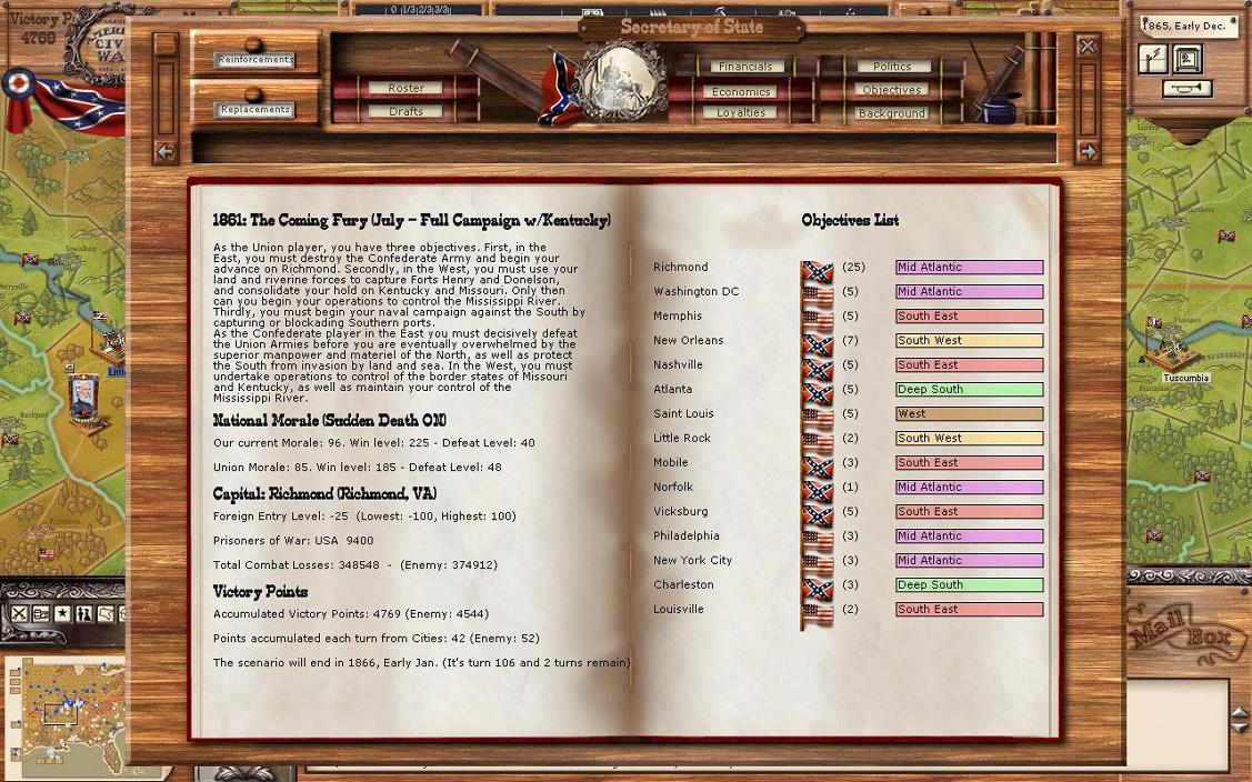 I’m going with the prisoner of war exchange. As the war is coming to an end, it times to let the boys go home, as was the case in the real war. Of course, the Union may not have agreed. I currently have 7,700 PoW.