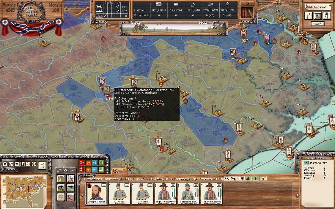 The Union has a number of towns and cities in NC. Unfortunately I don’t have the resources to get them back, although I’m sending a cavalry regiment from TN a another regiment will could move from Camden SC next turn.