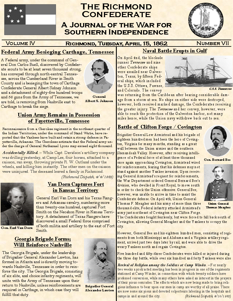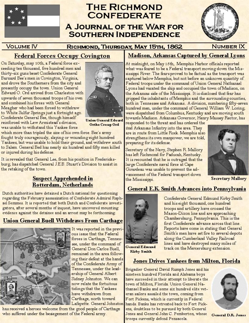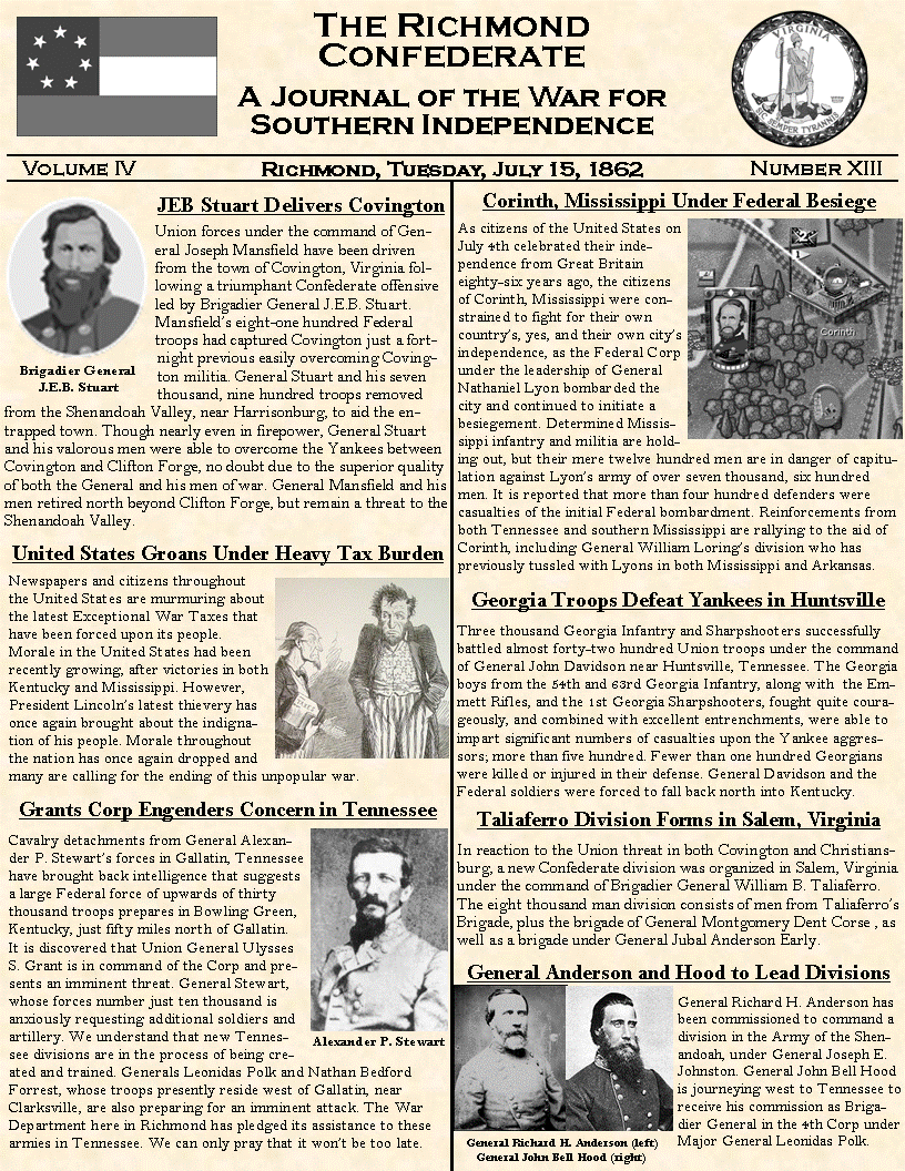 I've tried that unsuccessfully, and am pretty concerned about a growing Federal army in Bowling Green, Kentucky which is lead by U.S. Grant. I am trying to build a wall of defense along the Tennessee - Kentucky border because of it. So I'm hesitant to transfer too many troops west to initiate an offensive on Cairo. But, it looks like I need to take a chance here. I'm about two months ahead of the newspaper issues that I have released, so it will be at least Fall before I can do it. I may not be able to do it, I fear, before winter kicks in. :siffle: