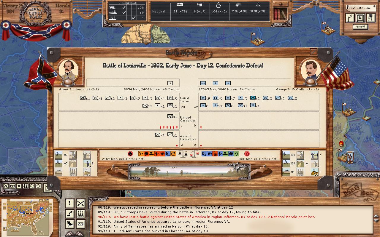 This is how you learn to play better, and I bet you've learned a ton already. OAM will surely teach you, as he is a stern taskmaster! Longshanks wrote:I guess you see the handwriting on the wall. It will be hard to resist for many reasons that I see: 1) your NM is so low and so your cohesion is low too; 2) you're outnumbered by cannons in every fight; 3) you lack support troops like hospital and signal in nearly all your stacks, while he doesn't; 4) all his victories have earned "stars" for his leaders and units, making them get better while yours get worse; 5) your supply situation is rough as you have noted - lack of SUs makes combat go badly - even VERY badly in later rounds of a fight because you lack ammo; 6) you've attacked several times across rivers but without Marines/sailors, etc to help you with the river crossing, thus incurring a stiff penalty. I'm sure there are more.