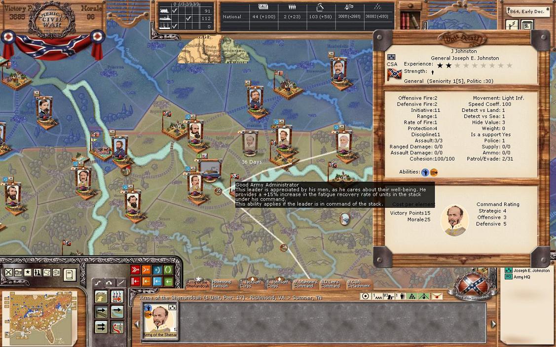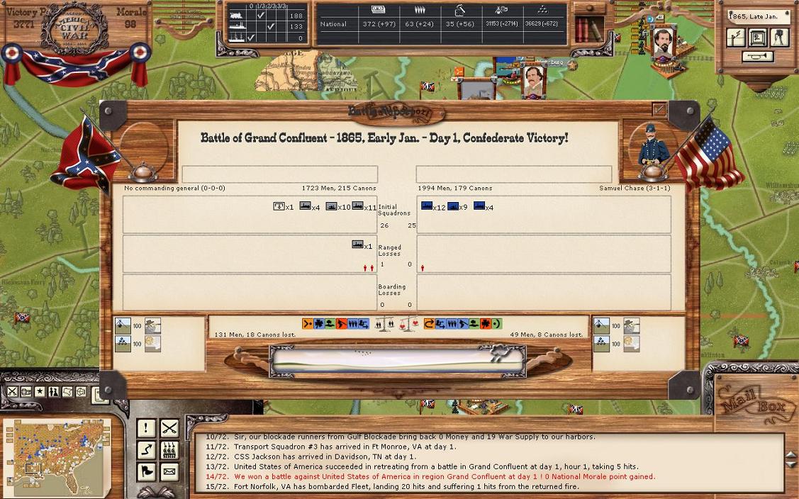 It was a pretty good turn for industrialization; Petersburg +24 and Hampton +14. There were no battles, but Mortar has surprised me by going straight for the east west Virginia RR. Clearly, my plan to open up some additional supply that way isn’t going to happen. The big move is that Kearney’s corps has moved in Burkeville. I also made a mistake in my division restructuring. I wanted to send Winder’s division from Richmond to Petersburg, but I seem to have forgotten to do that. So, Petersburg is virtually undefended. Winder’s division from Richmond will go to Petersburg and be there in 2 days, which should be enough to stop any attack that would happen there, although I don’t really expect an attack as I think he knows I have quite a large force in Richmond ready to move. Basically, Trimble’s brigade fled Burkeville back to Petersburg. I’m pulling the cavalry unit in Campbell back to Petersburg. And I’ll let the cavalry unit in Covington to rest 1 more turn. In addition to sending Winder to Petersburg, I’m sending a small brigade from Longstreet to Lee and a small brigade from Jackson to Petersburg. The Union now has power of 6000 in the 3 regions of Buckingham, Appomattox, and Camden. If the Union wanted, they could bring that all that to bear against Lee. My fleet is still in Norfolk and is nearly 100% (current power 2158). The Union has rebuilt all the RRs in WV, I still hold Grafton un-garrisoned there. Supply in Richmond is 266 / 1981