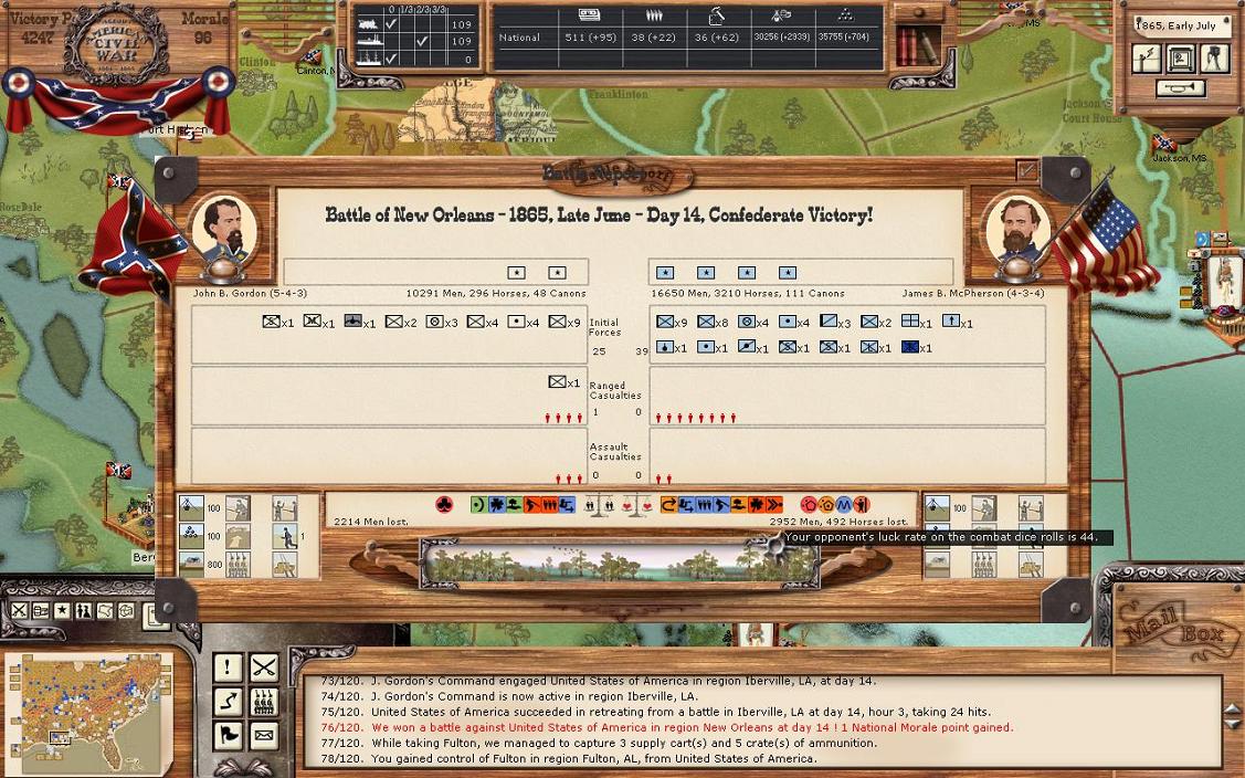 Confederate wrote:Charles, I have to congratulate you for making it to June 1865 and still being in the war, although he looks like Mortar is looking to launch an assault at Richmond. Good thing you have the genius defensive man Longstreet in Richmond with Lee not too far. Doesn't look like he'll be able to pass anytime soon![]()