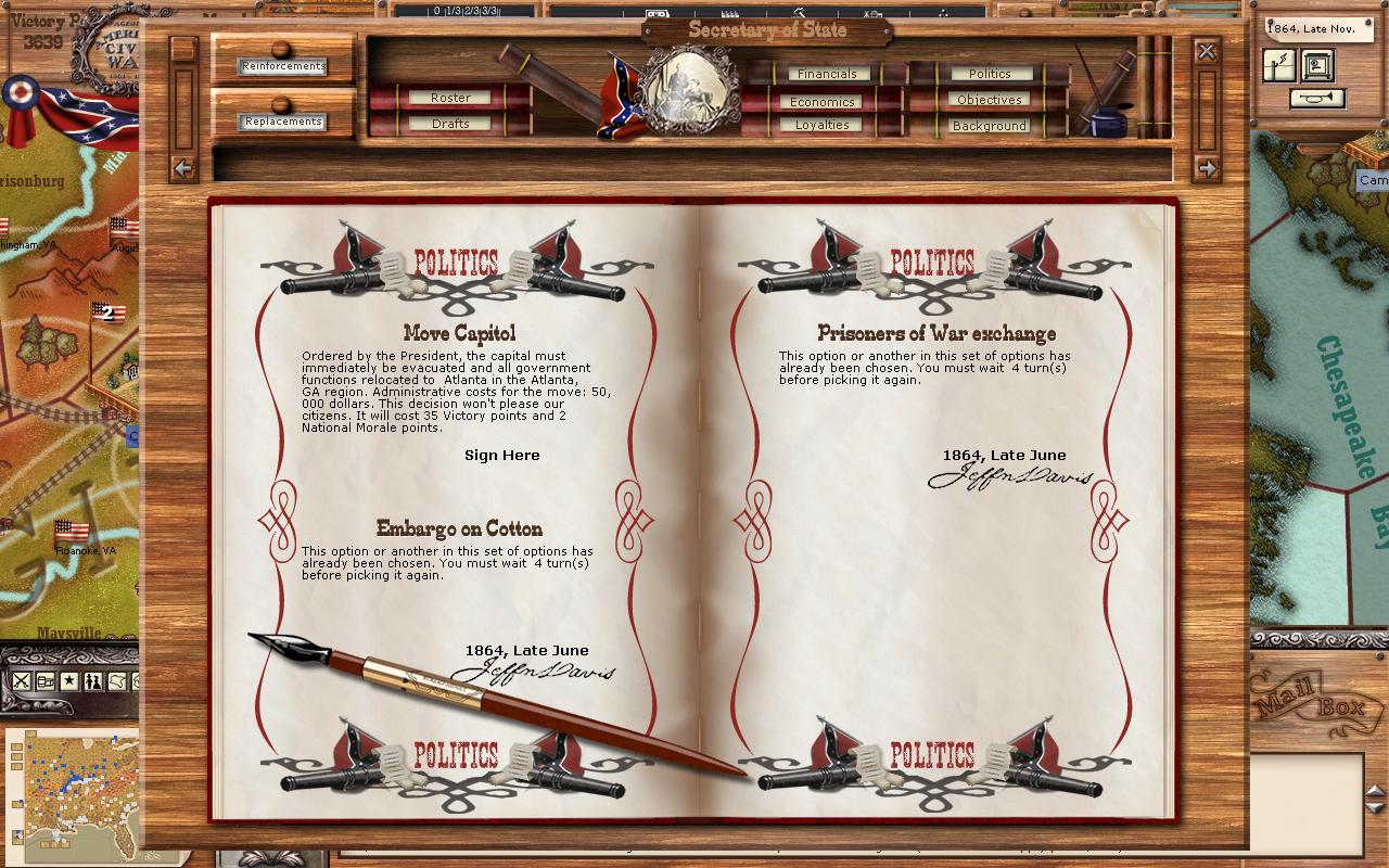 Move capital: Moving the capital is an option in the game just as it was in real history. Historically, the capital was moved from Montgomery to Richmond early on in the conflict in 1861. It was never moved again though. That isn't to say it shouldn't have been moved from Richmond in 1864, but the CSA didn't, according to Jeff Sharra's novels because of Davis' insistence that Richmond be held at all costs, which led to the siege of Petersburg and the rest is history. Now, by clicking on the paragraph below move capital it will scroll through options on where you can move the capital. Currently for me these are Memphis, New Orleans, and Atlanta. As I mentioned earlier, I've chosen to not move the capital in this game no matter what.