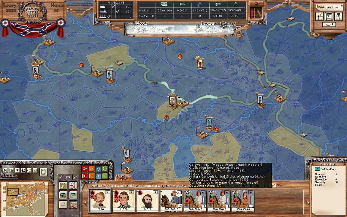Loyalty is very important in the game. Basically, the higher the loyalty of a town, the more they will produce. Towns with low loyalty that you control that aren’t garrisoned can have partisans appear. Furthermore, if the loyalty is low partisans can appear. Loyalty also gives you detection bonuses. If region is especially hostile (loyalty less than 10%) and it isn’t garrisoned, an enemy unit will take over the region. Searching loyalty in the manual will give you some more specific %s. In my case here, you will see I have full liberty for all of my states. You will also notice a couple other points; I can’t change Arkansas, MO, and Kentucky. This is because I don’t control the state. Finally, take a look at the right of the picture, it gives details on VA. Fairfax gives me 0% as it has been under Union control the entire game. Basically, the people there never expect to see the CSA again. Ft. Monroe on the other hand is 100%.
