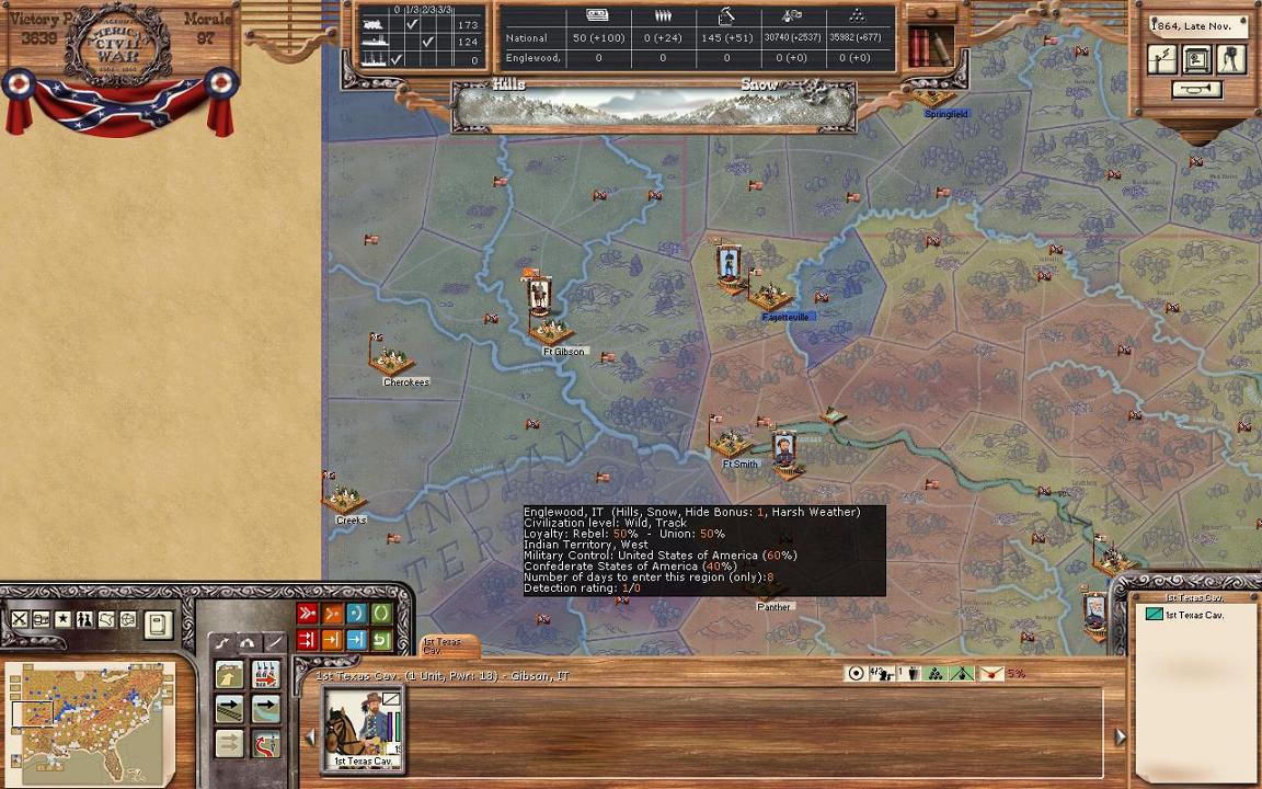 In Texas, I’m splitting the Gordon division into 2 divisions, with Armstrong now commanding a brigade sized division in Dallas and Gordon going with the majority of the division to Shreveport. I want to be closer to what Lyon’s force in Louisiana is up to. I thought about sending Gordon to try to take back Ft. Smith in Arkansas but with winter fast approaching, I was worried of getting stuck and starving. Finally, the cavalry unit in the IT will head south to join Armstrong.