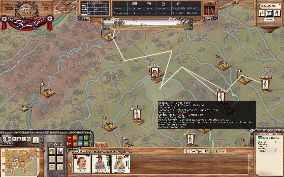 If you now look to your right, you will see the Objectives list. The list shows the names of the cities, the flag (who currently controls the objective), a number in parentheses (I believe this is the NM hit you take or gain by taking the objective. Can someone confirm this?), and the region they are in. A player doesn't pay attention to his or her objectives at their peril. Objectives generally are strategic locations, provide conscripts, WS, $, or are a key harbour. Losing them really hurts your war effort. The CSA has 9 objectives and the Union 6. However, the Union controls St. Louis, Little Rock, and Louisville. That should tell you that the CSA has not made head way or been able to hold MO, Arkansas, and Kentucky. All the objectives are reasonable except for New York City. I've never understood why it was there. The CSA taking New York City is beyond the realm of possibility in history, and should be in this game too. Baltimore MD or Harrisonburg PA would be more realistic objectives.