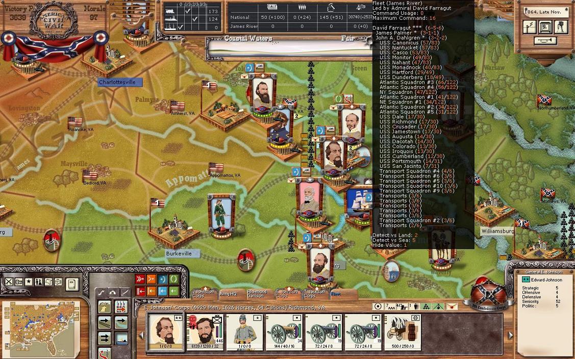 In Virginia, I’ve decided upon a few movements. A cavalry unit will try to take over Covington and a raider unit will go for Lynchburg. I’m taking part of E.K. Smith’s Corps to attack the sharpshooter unit in Burkeville; Trimble will lead the Texans in this. Finally, and the big one, I’ve decided to send the fleet out of Richmond. I’m nervous just thinking about it, but the Union fleet is low on cohesion and my fleet is in perfect order now. This will be a probing attack.