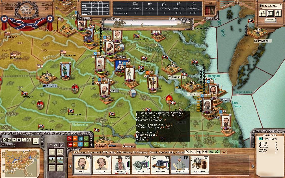The final 2 forces in Virginia are Norfolk and Ft. Monroe. General McCowan’s command of 2780 / 528 / 21 commands the forces inside Ft. Norfolk with the coastal artillery. General Pemberton has a sole militia unit outside the outside the fort. Norfolk produces 78 a turn in supply, a decent amount. General Picket commands a sole militia unit in the defences of Ft. Monroe. I really would like a division here as well as in Norfolk, but as I’ve been pushed all the way to the gates of Richmond, Richmond has taken a higher priority. Surprisingly, the Union hasn’t tried a sea invasion to take Ft. Monroe back. Perhaps something to come in the future…..