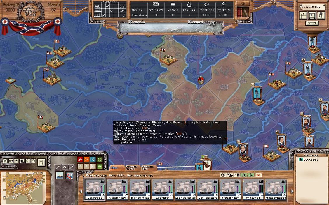 On to North Carolina! I control the state, but I said earlier, I destroyed the Raleigh and Garysburg depots due to a Union invasion of the state. You will see that I have a fleet based in Wilmington. My great idea was to build a fleet and send it to the shipping lane to sink the union ships in a battle. However, actually there are no “battles” in the shipping lane in the traditional game sense. We each gave each other some hits, and then I went back to Wilmington. It was clearly disappointing. I’m not really sure what to do with these ships now, perhaps have them link up with the Virginia fleet if that is ever out of Richmond again.