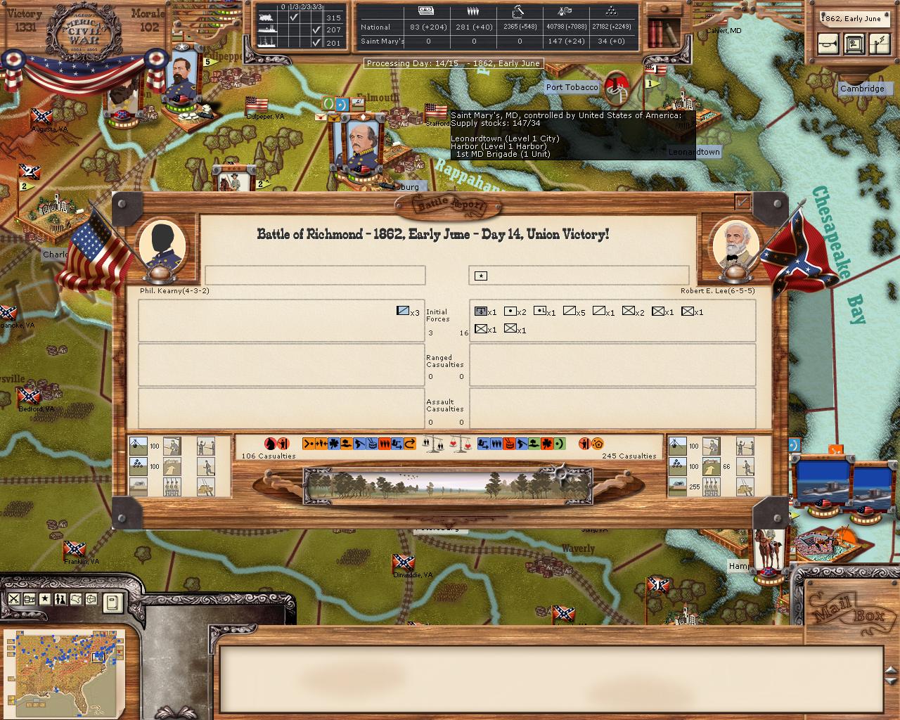 Unfortunately, Gen. Kearny and his command were annihilated later in the month when Gen. Longstreet arrived with his entire corps. Still the campaign has been extremely sucessful so far. I managed to inflict a crushing defeat on the rebs at Fredricksburg, an odd twist of fate indeed.