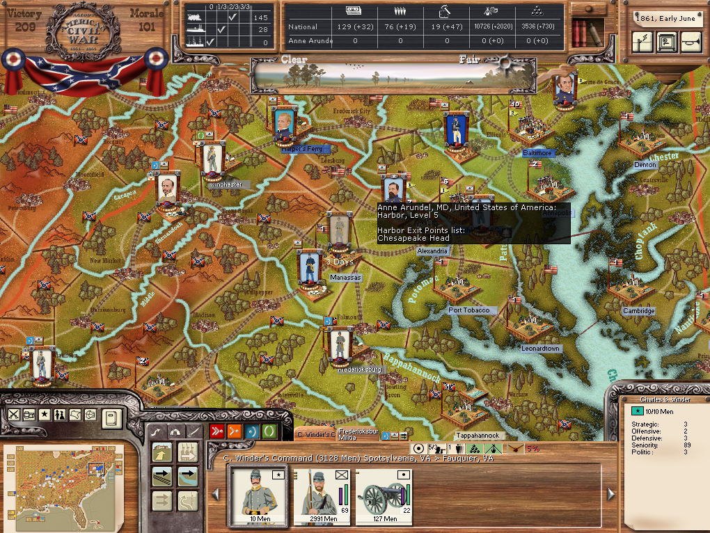 Harper’s Ferry looks very takeable early-on. Manassas, though not a great place to defend, is a strategic point that we will occupy. If he doesn’t, I will pick a fight in ’61, to see how far we can press the Yank, and also to get some leaders promoted (like Stonewall!)