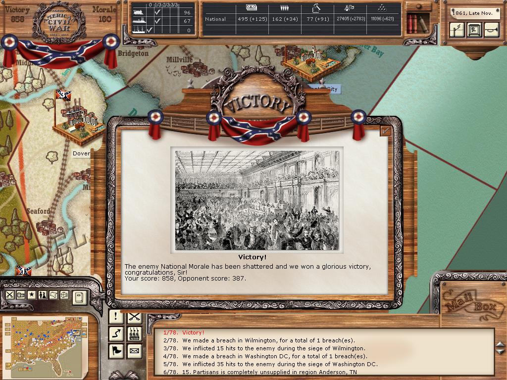 Wow, late 1861, I've captured Washington, the end. My settings are low fog of war advantage to AI, hard AI setting, no activation rule normal aggressiveness. The Union had gathered by Winchester and Harpers Ferry, and sent raids South of there which I ignored. I took Alexandria and they didn't react. Washington had a Garrison of about 40 units or so. I moved the army up to Alexandria and attacked with Johnson's Corps Washington in the same turn. So they both attacked, total of 101 units. The next turn I put the assault on, bingo end game. You should have seen them scrambling!; but alas....too late! I have added a couple of screen shots, there ya go! I love this game,