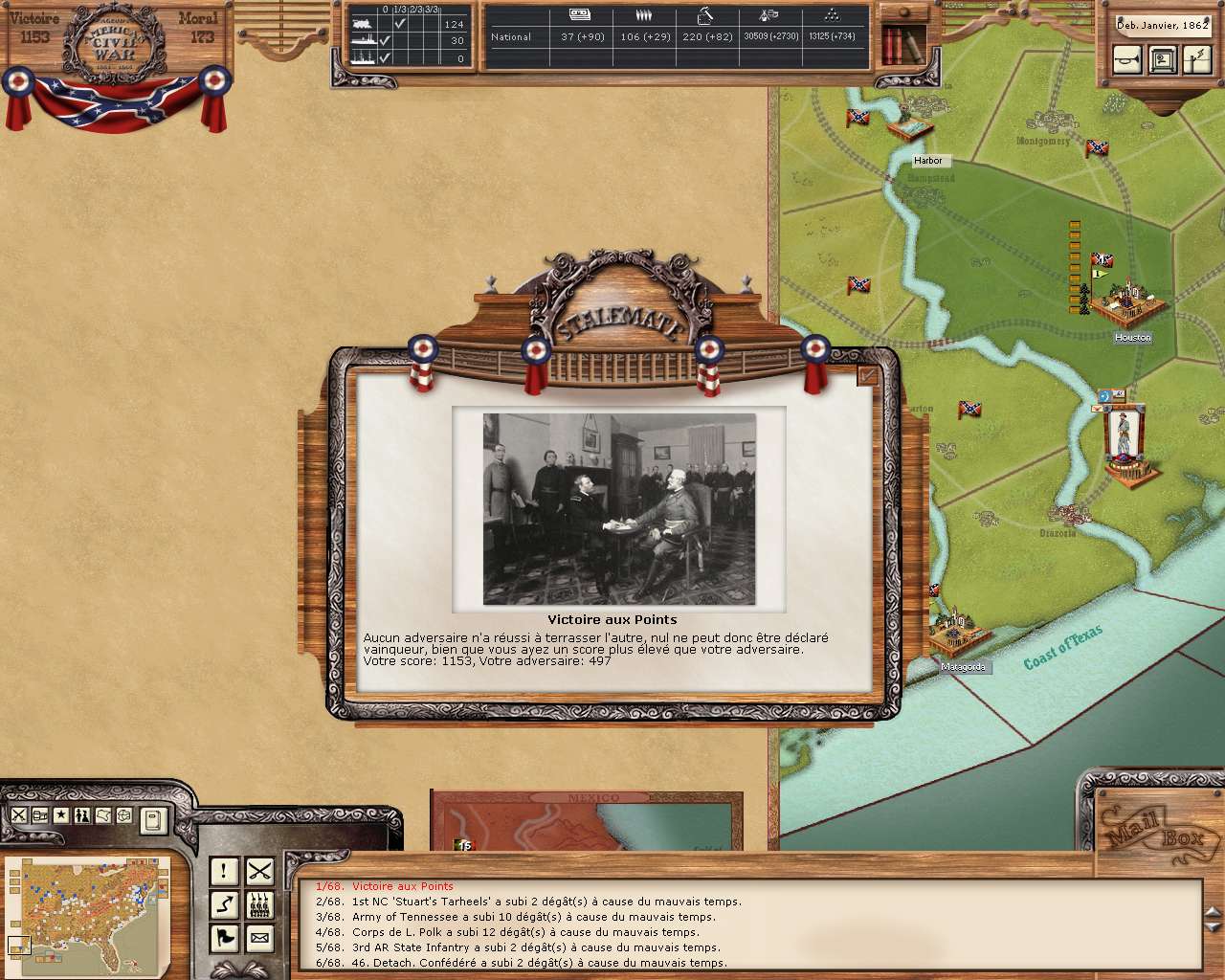 juste un petit point de détail mais j ai remporte une campagne (avant la fin) avec les confederes par prise de Washington (moral de l union en dessous de 40 mais moi je n atteint pas non plus le seuil des 200) le jeu s est arrete en me gratifiant d une victoire aux points est ce normal je me serais attendu a une victoire "décisive"
