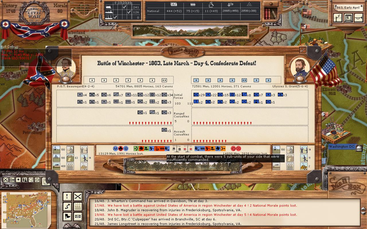 It appears to me Beuregard indeed had the fight to death command. In the little experience I have, I have found it generally to be a bad idea to have Army leaders sit inside cities, because they choose automatically fight to death stance, and if they then happen to march to the sound of guns... :shiver: